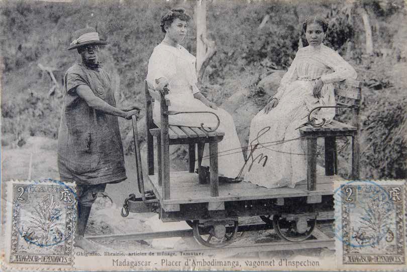 Het verschil in maatschappelijke positie tussen duwer en passagiers is op deze prentbriefkaart uit Ambohimanga in het noorden van het eiland Madagaskar zichtbaar.
