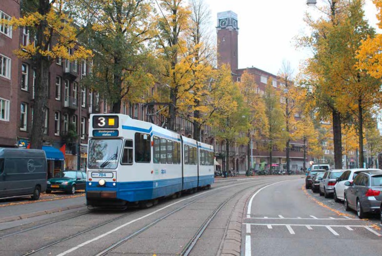 Lijn 3 op het middelste deel van de route waar de lijn is geknipt – een plan uit 1926 dat in 2026 tot uitvoering kwam. De 784 doorloopt de flauwe bocht van de Roelof Hartstraat. De toren is onderdeel van Het Nieuwe Huis, een markant appartementengebouw voor alleenstaanden aan het Roelof Hartplein uit 1928. | 18-11-2014