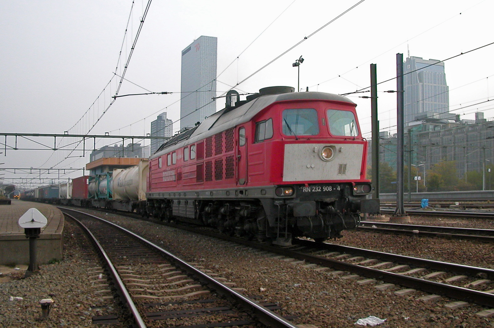 Rotterdam, 22 oktober 2003. Loc 232 908 met een containertrein die vanaf de Maasvlakte via Utrecht naar Emmerich rijdt. Foto: Nico Spilt.