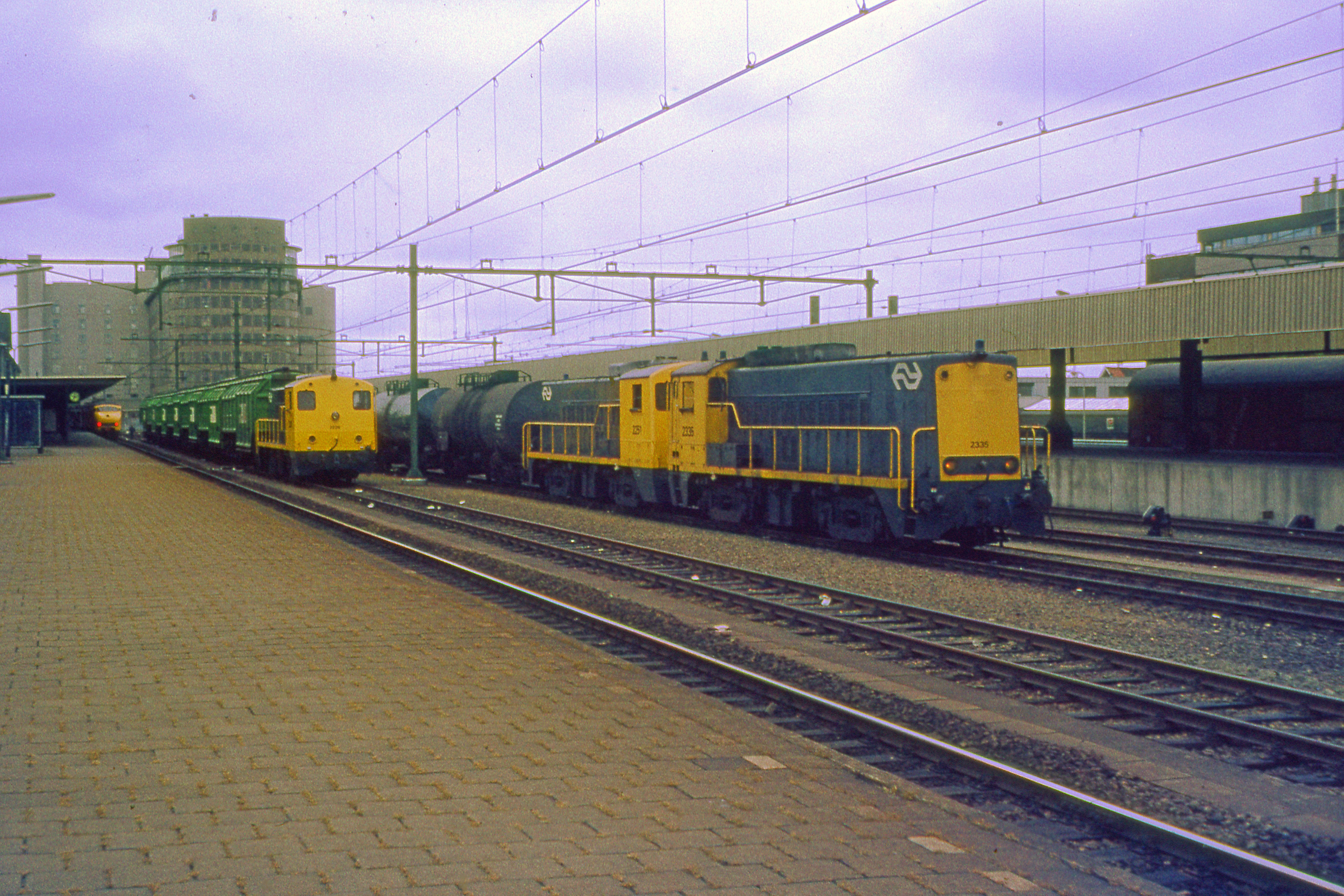 Locs van de serie 2200 in Den Haag HS op 26 mei 1984. De olietrein wordt getrokken door 2335 en 2251; de VAM-trein door 2229. Foto: Gerrit Nieuwenhuis.