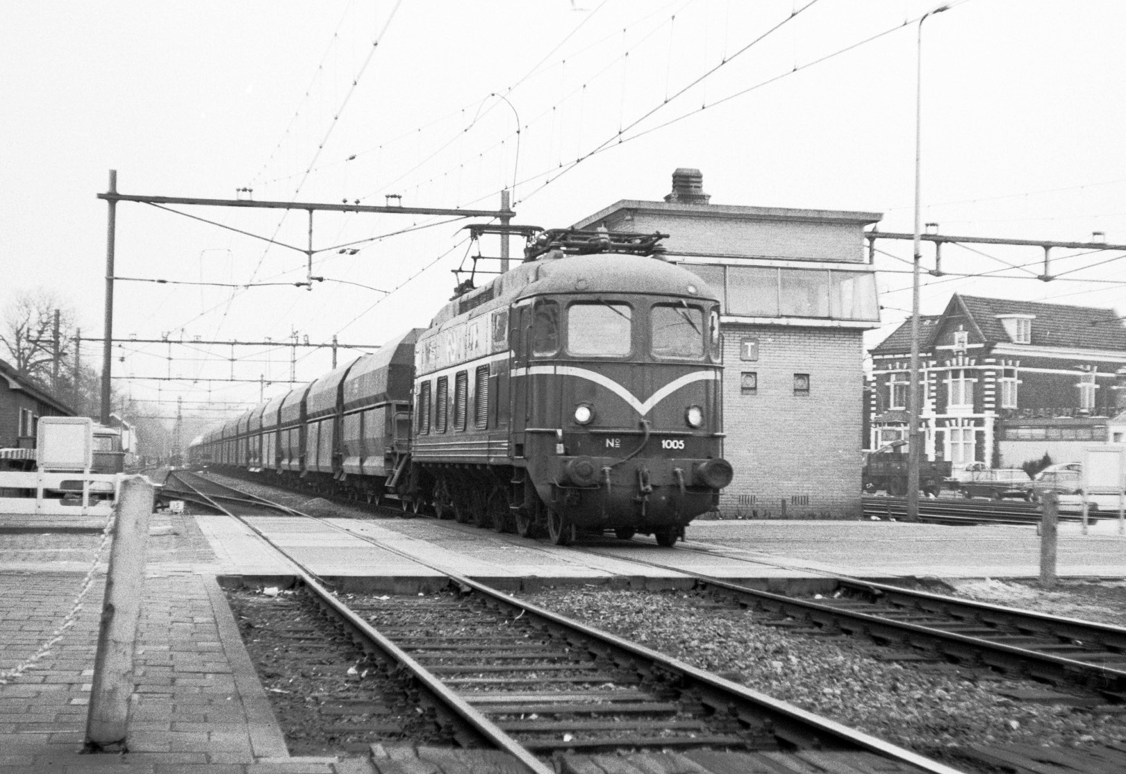 Hilversum, 16 december 1970. Loc 1005 met de dagelijkse (lege) kalktrein uit Beverwijk. Foto: Nico Spilt.