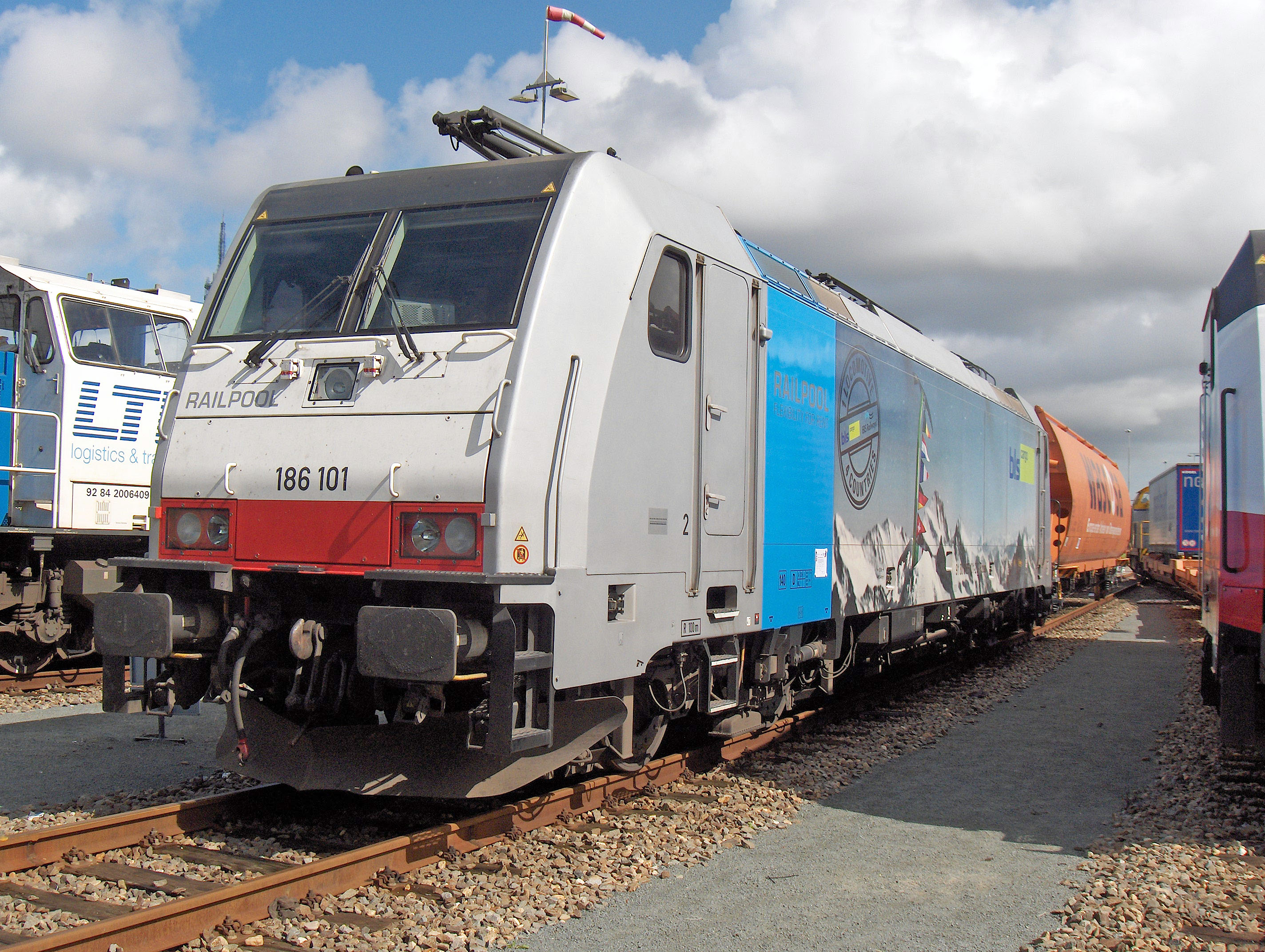 Bij de werkplaats van Shunter op de Waalhaven in Rotterdam stond op 5 september 2015 de TRAXX 186 101 van BLS Cargo. De locomotief nodigt uit voor een bezoek aan de Zwitserse Alpen. Foto: Gerrit Nieuwenhuis.