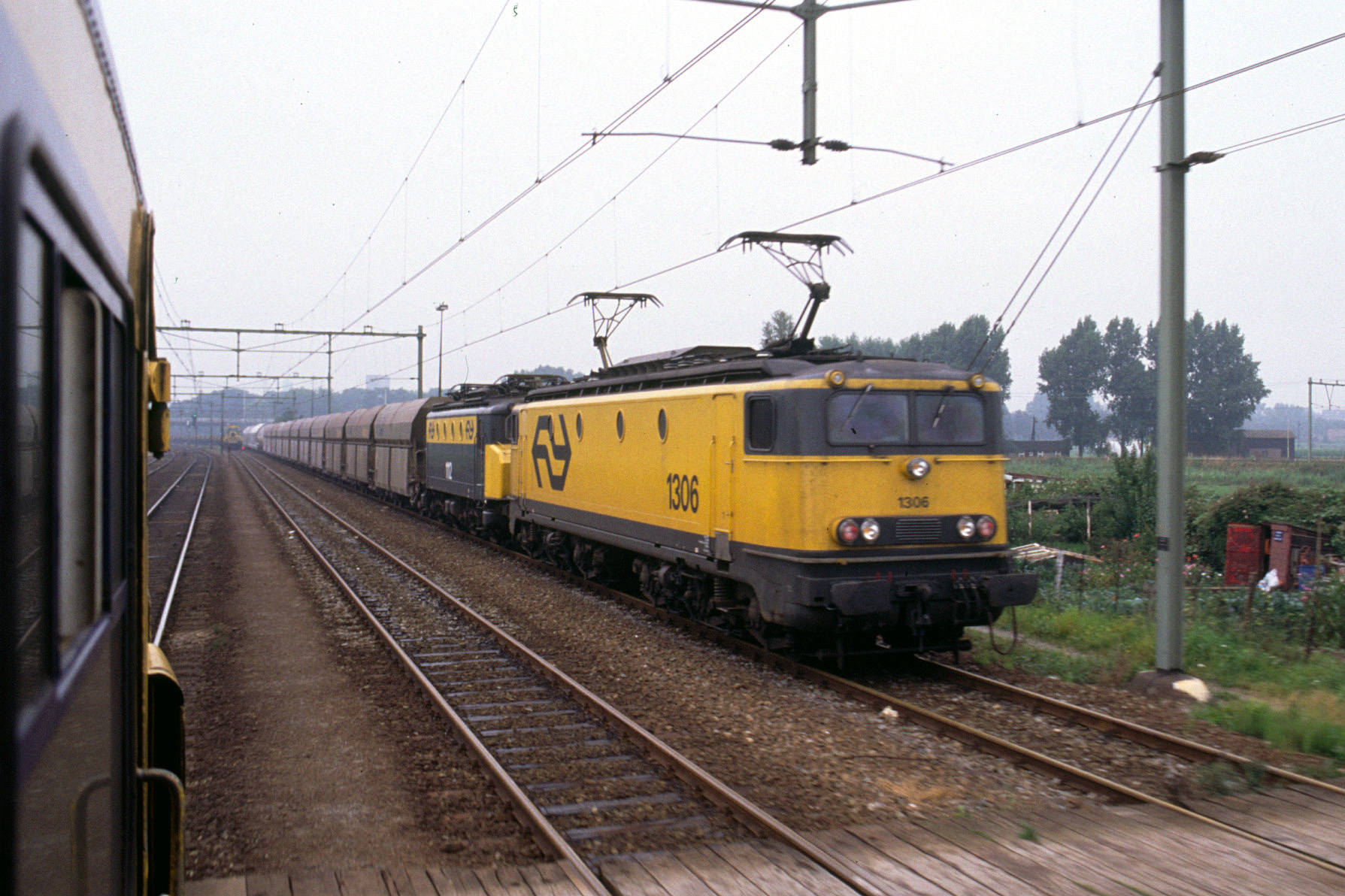 Utrecht Lunetten, 7 augustus 1989. Loc 1306 en een 1100 met een lege kalktrein richting het zuiden. Foto: Nico Spilt.