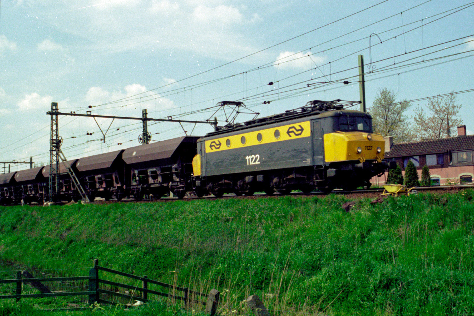 Woerden, 10 mei 1982. Loc 1122 (met botsneus) met zelflossers, komend uit de richting Gouda. Deze loc is bewaard gebleven. Foto: Nico Spilt.