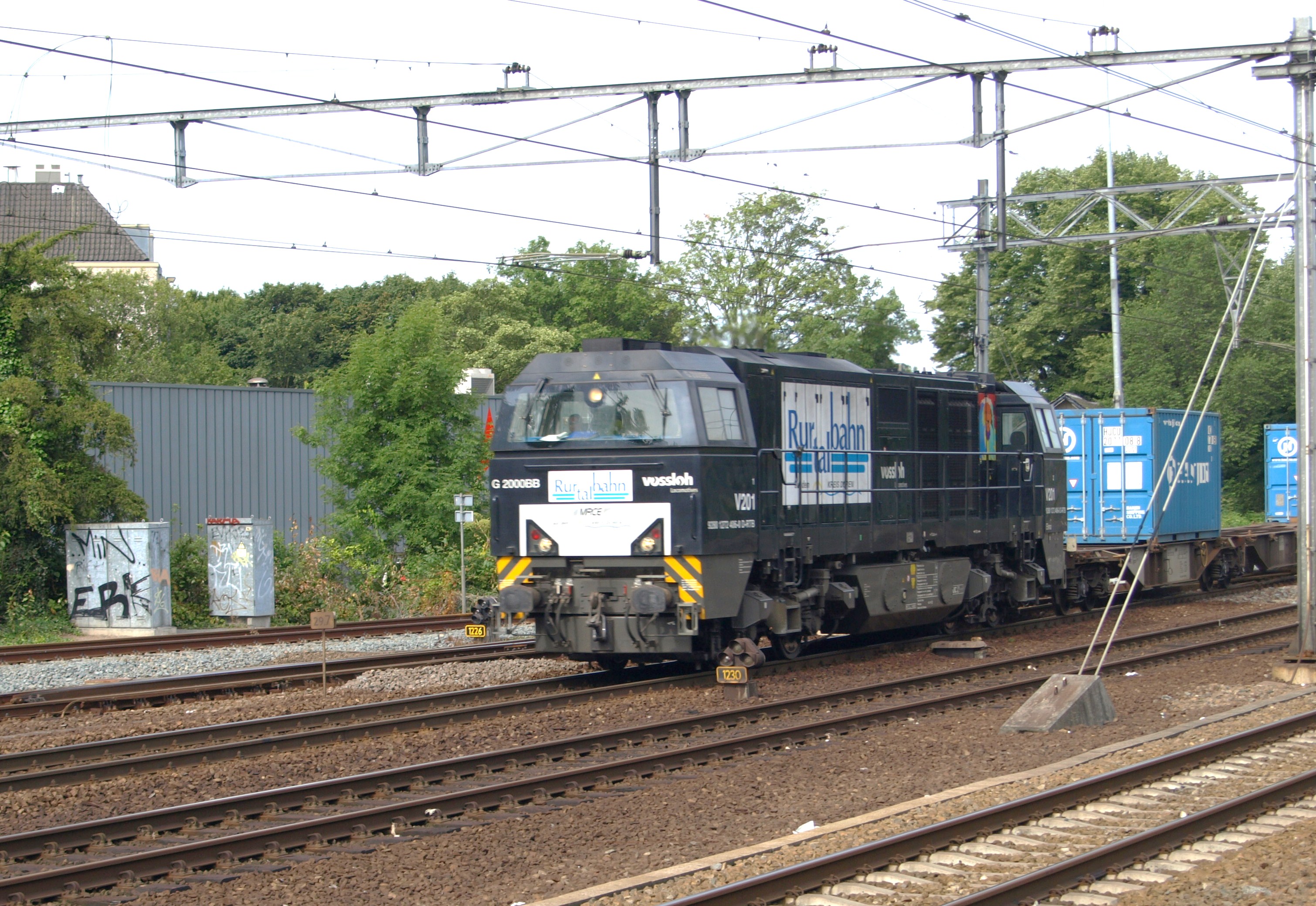 Op 21 juli 2009 rijdt RTB Cargo-locomotief V201 door Dordrecht. De locomotief is van het type G2000 van Vossloh. Foto: Gerrit Nieuwenhuis.
