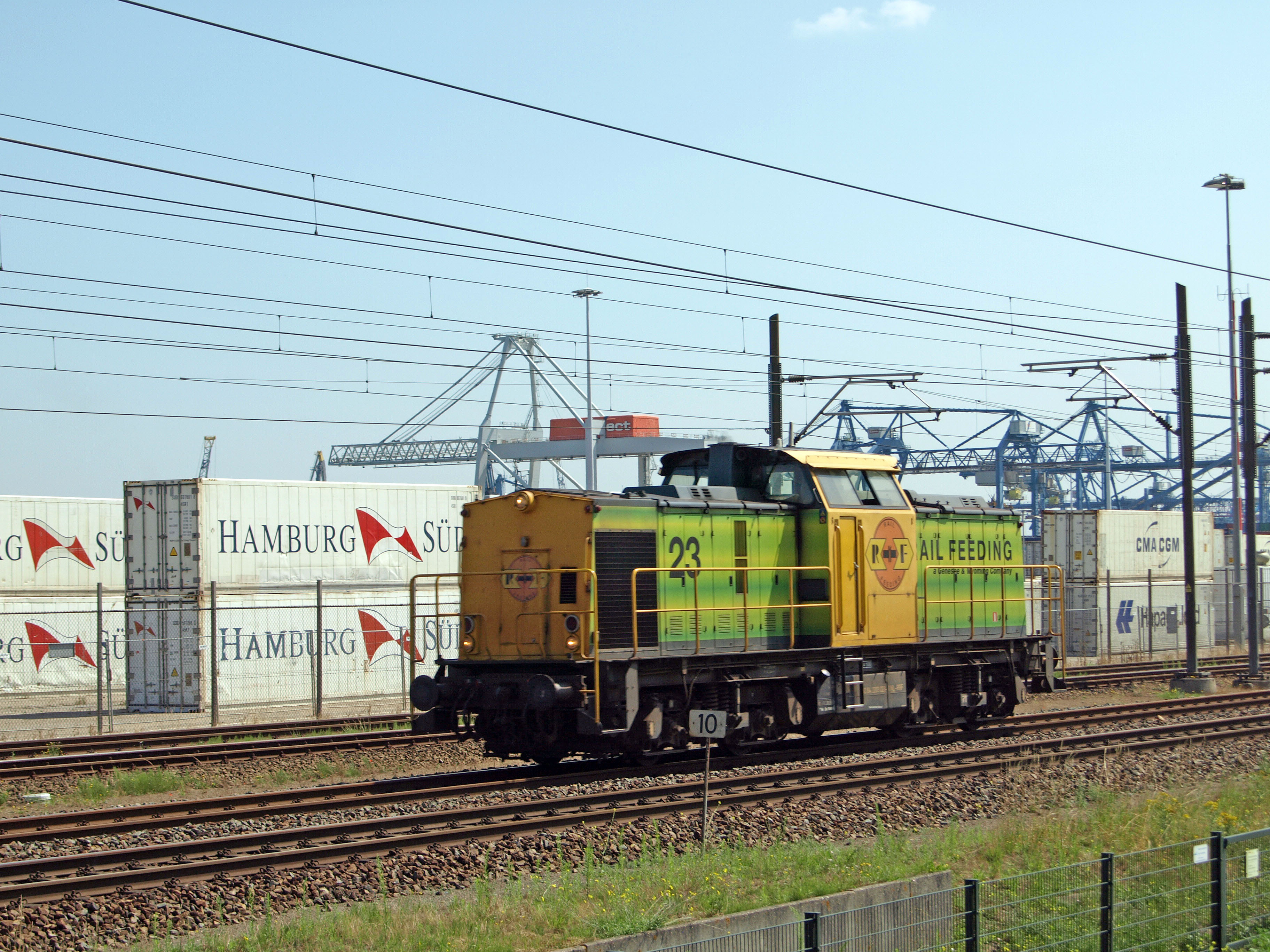Diesellocomotief 23 van Rotterdam Rail Feeding rijdt op 16 juli 2015 langs de vroegere ECT Home Terminal in Rotterdam Waalhaven. Foto: Gerrit Nieuwenhuis.