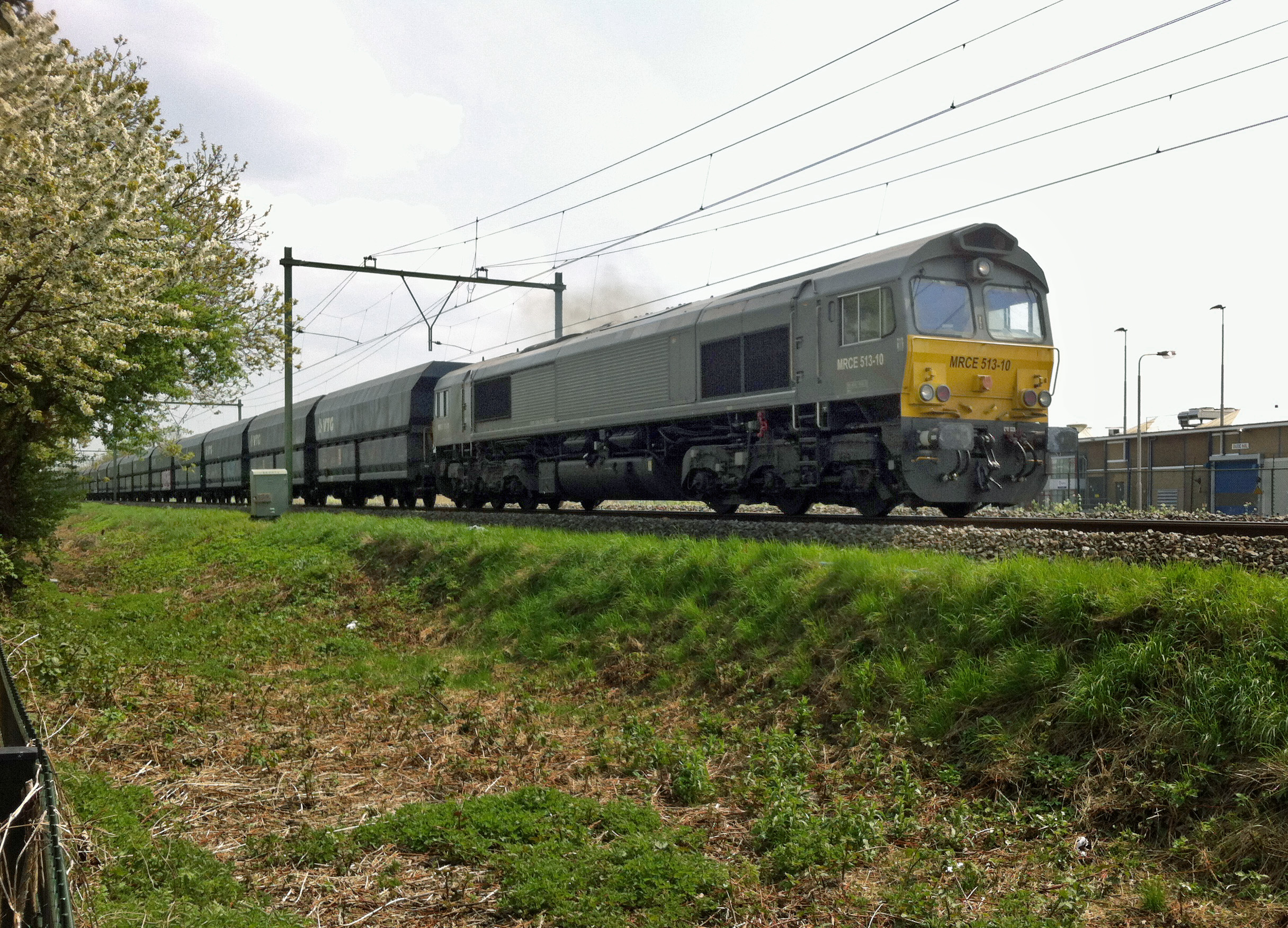 Bunnik, 6 mei 2013. Loc MRCE 513-10, rijdend voor RheinCargo, met een lege kolentrein op weg naar Amsterdam. Foto: Nico Spilt.