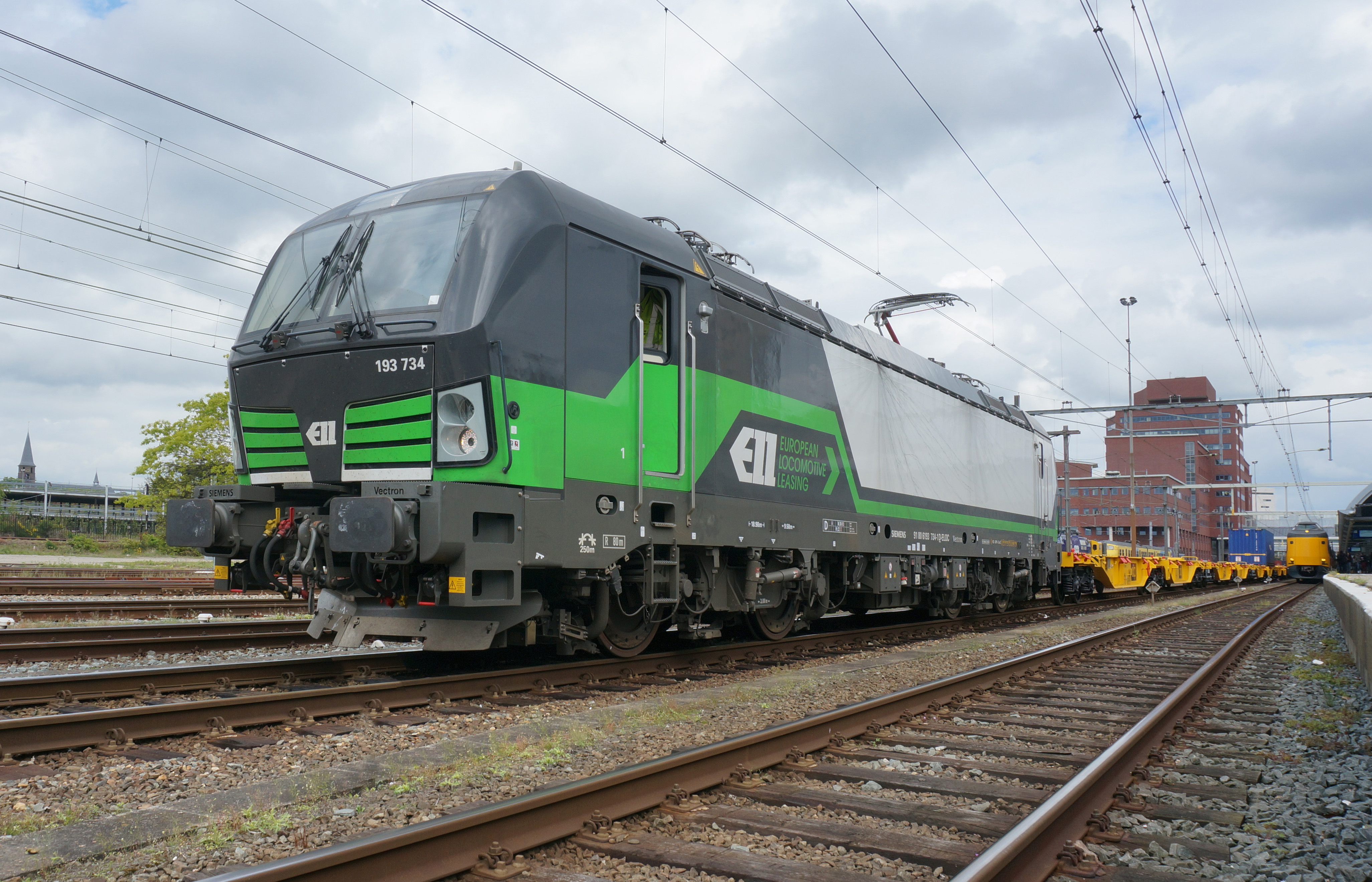 Amersfoort, 10 mei 2019. Loc 193 734, een Vectron van Rail Force One, met een matig beladen containertrein van Wrocław naar Moerdijk. Foto: Nico Spilt.