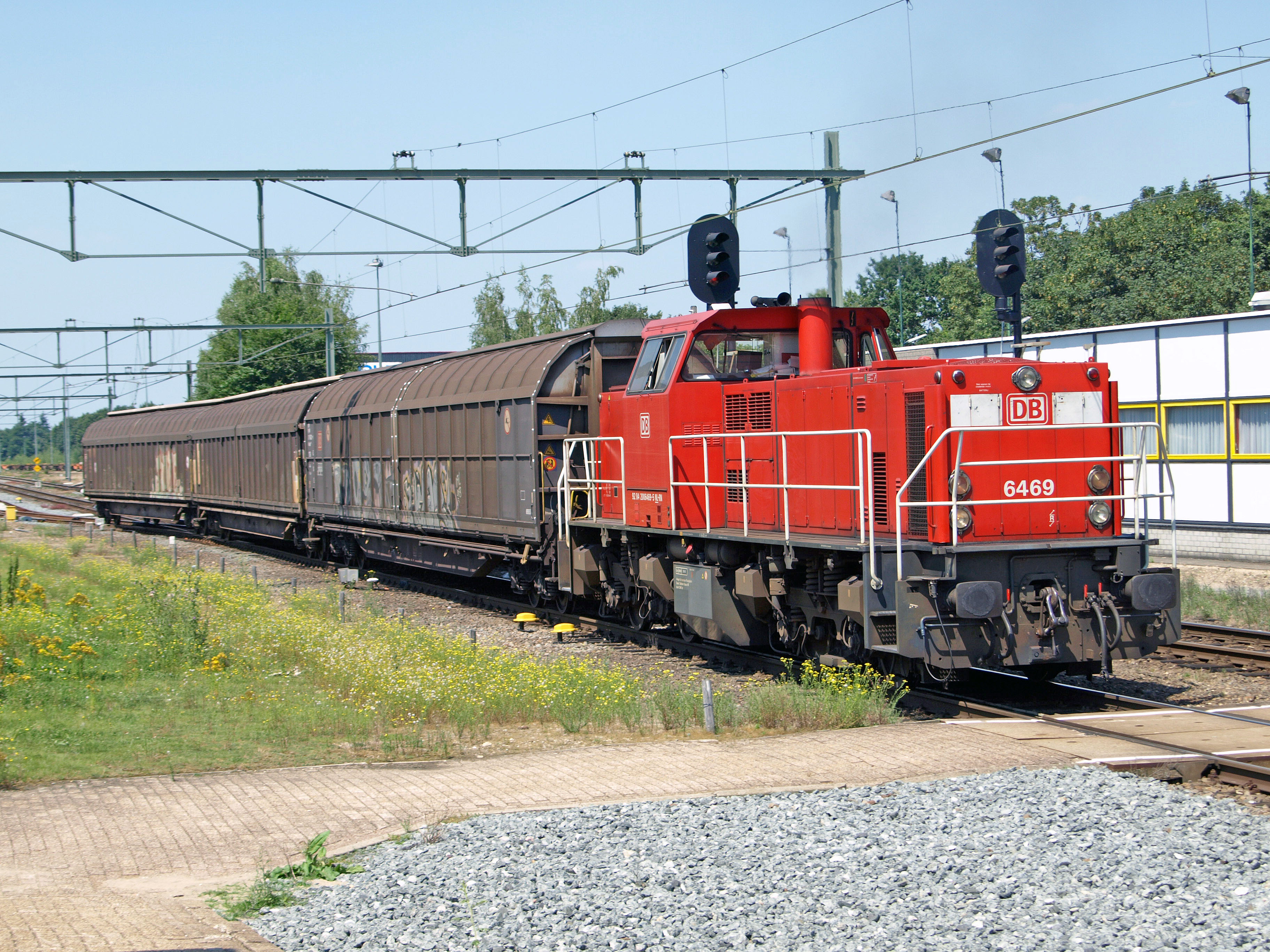 DB Cargo kent nog veel wagenladingvervoer, zoals in Blerick. Locomotief 6469 rangeert hier op 17 juli 2016 met enkele wagens. Foto: Gerrit Nieuwenhuis.