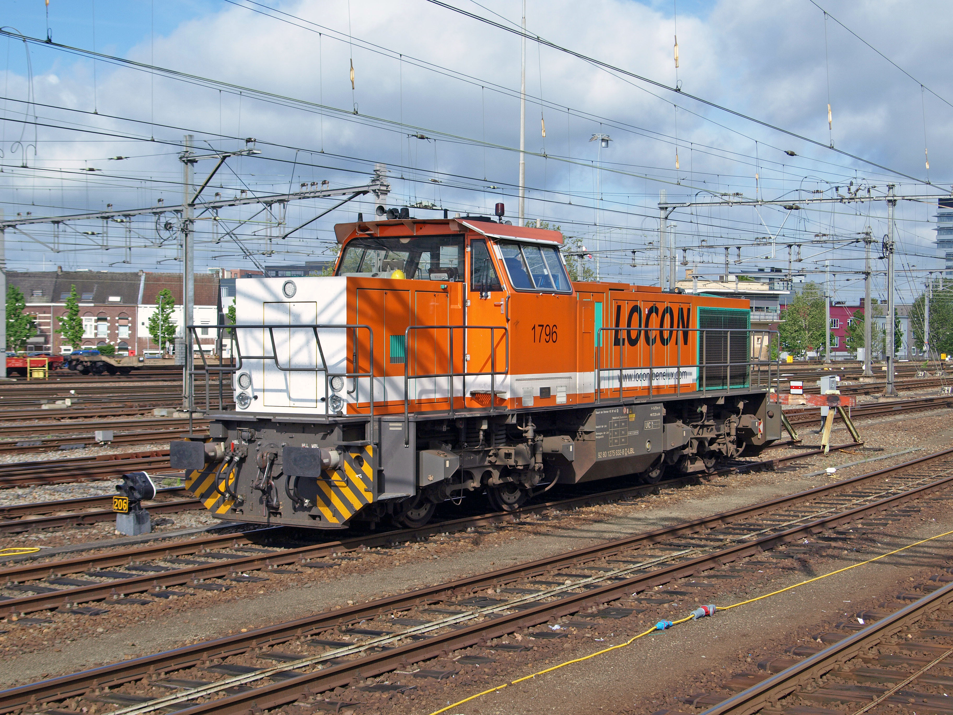 Een locomotief van het type G1206 van Vossloh was als 1796 in dienst bij Locon. In afwachting van een volgende rit staat de locomotief op 13 mei 2017 in Venlo. Foto: Gerrit Nieuwenhuis.