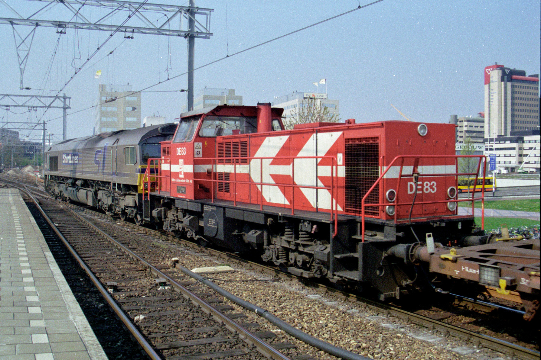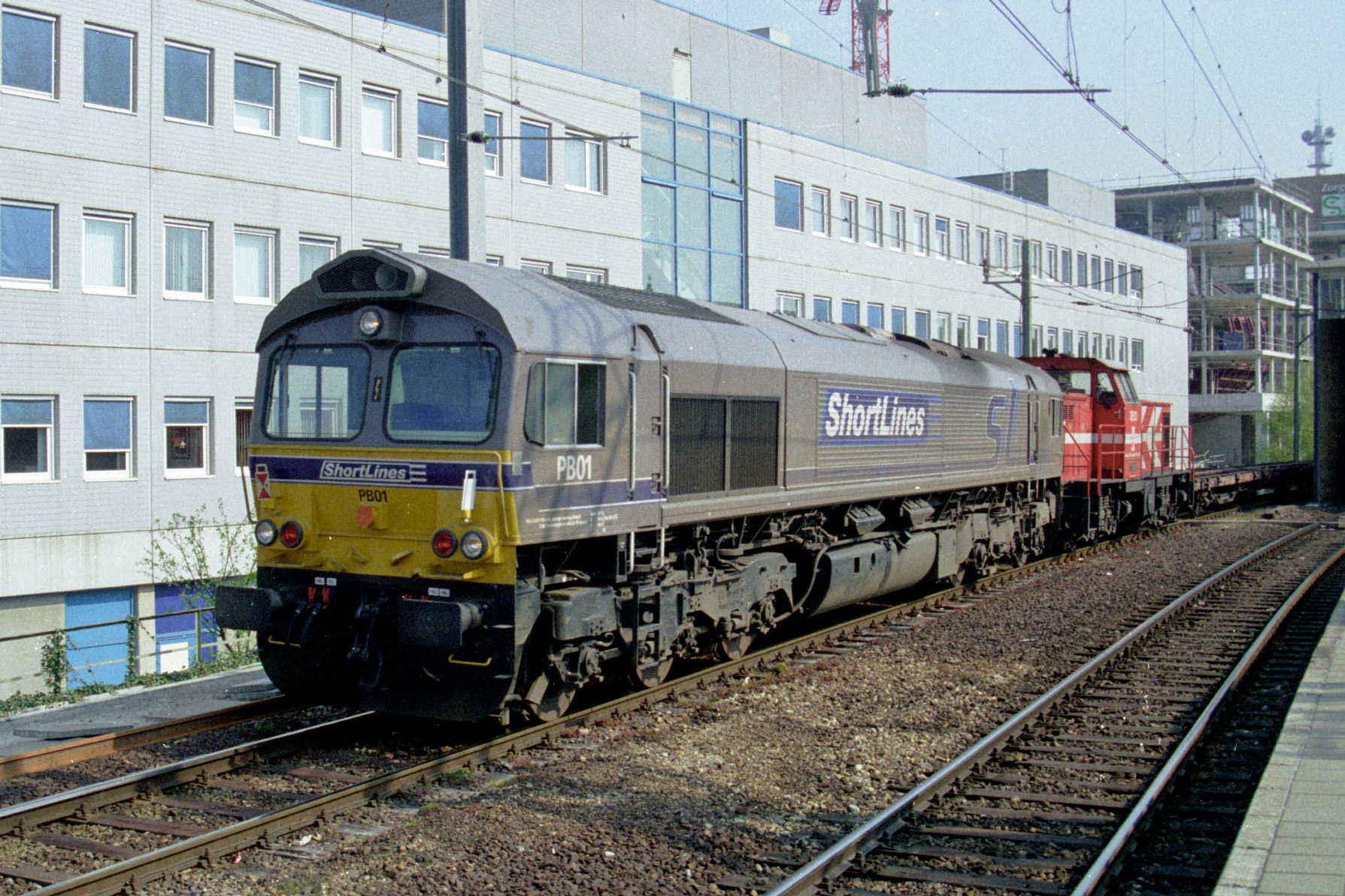Eindhoven, 10 april 2002. Locs PB 01 (Shortlines) en DE 83 (HGK) trekken samen op met een trein naar Rotterdam. Foto’s: Nico Spilt.