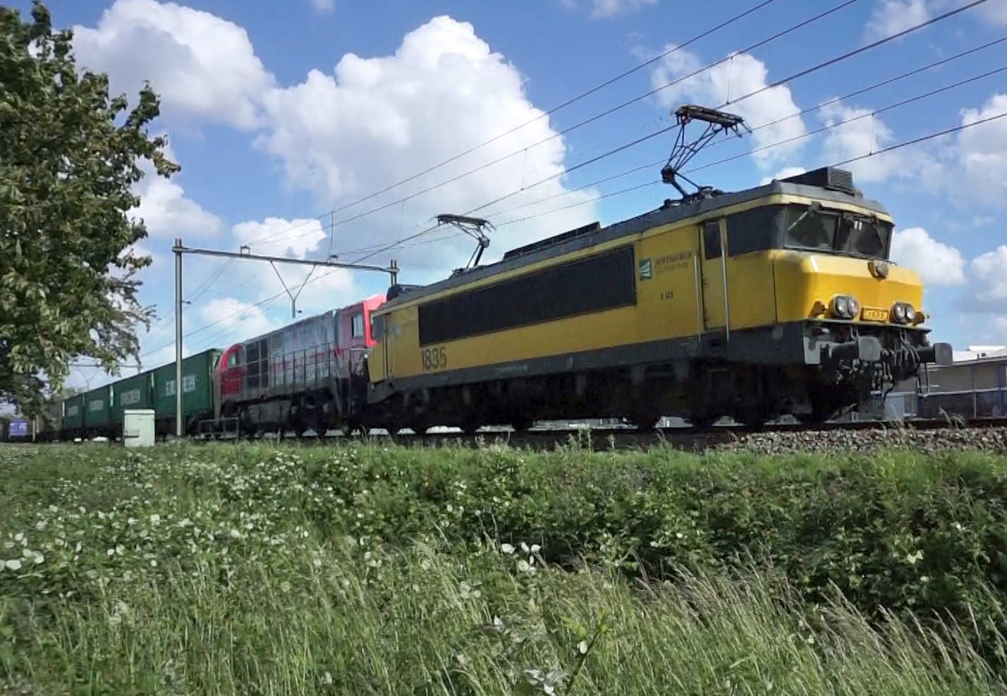 Bunnik, 23 mei 2020. Loc E01 (ex 1835) van de Bentheimer Eisenbahn is met een containertrein onderweg van Coevorden naar Rotterdam. De trein reed een ongebruikelijke route, met kopmaken bij Maarsbergen. In opzending rijdt loc 2104 van IRP mee. Foto: Nico Spilt.