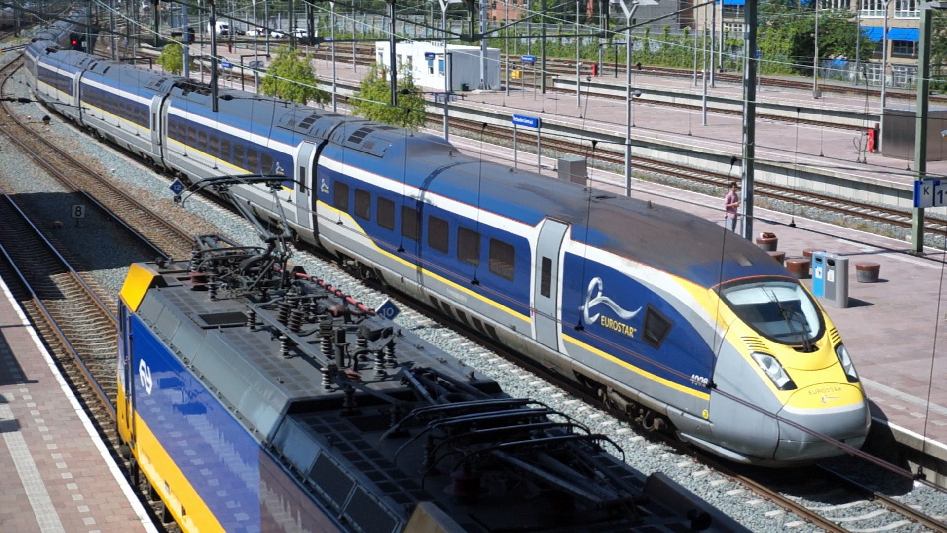 Rotterdam Centraal, 17 mei 2018. Vertrek van een Eurostar richting Amsterdam. Op de voorgrond een Intercity Direct. Beide treinen maken gebruik van de HSL. Foto: Nico Spilt.