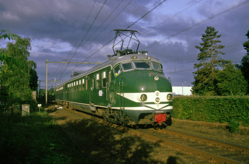 Hondekoppen vormden vele decennia de ruggegraat van het sneltreinnet van de NS. Treinstel 766 van de Stichting Hondekop bij Den Dolder, 2 september 2003. Foto: Nico Spilt.