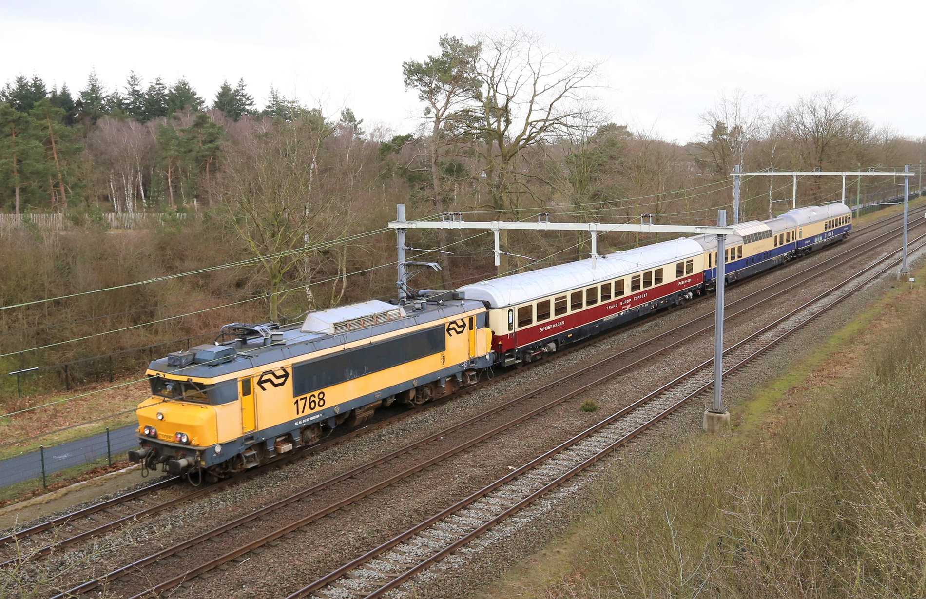Vanaf het ecoduct bij Den Dolder, 13 maart 2021. Loc 1768 brengt drie Duitse restauratierijtuigen terug die enige maanden in het Spoorwegmuseum te zien zijn geweest. De loc behoort tot de museumcollectie. Foto: Jan Post.