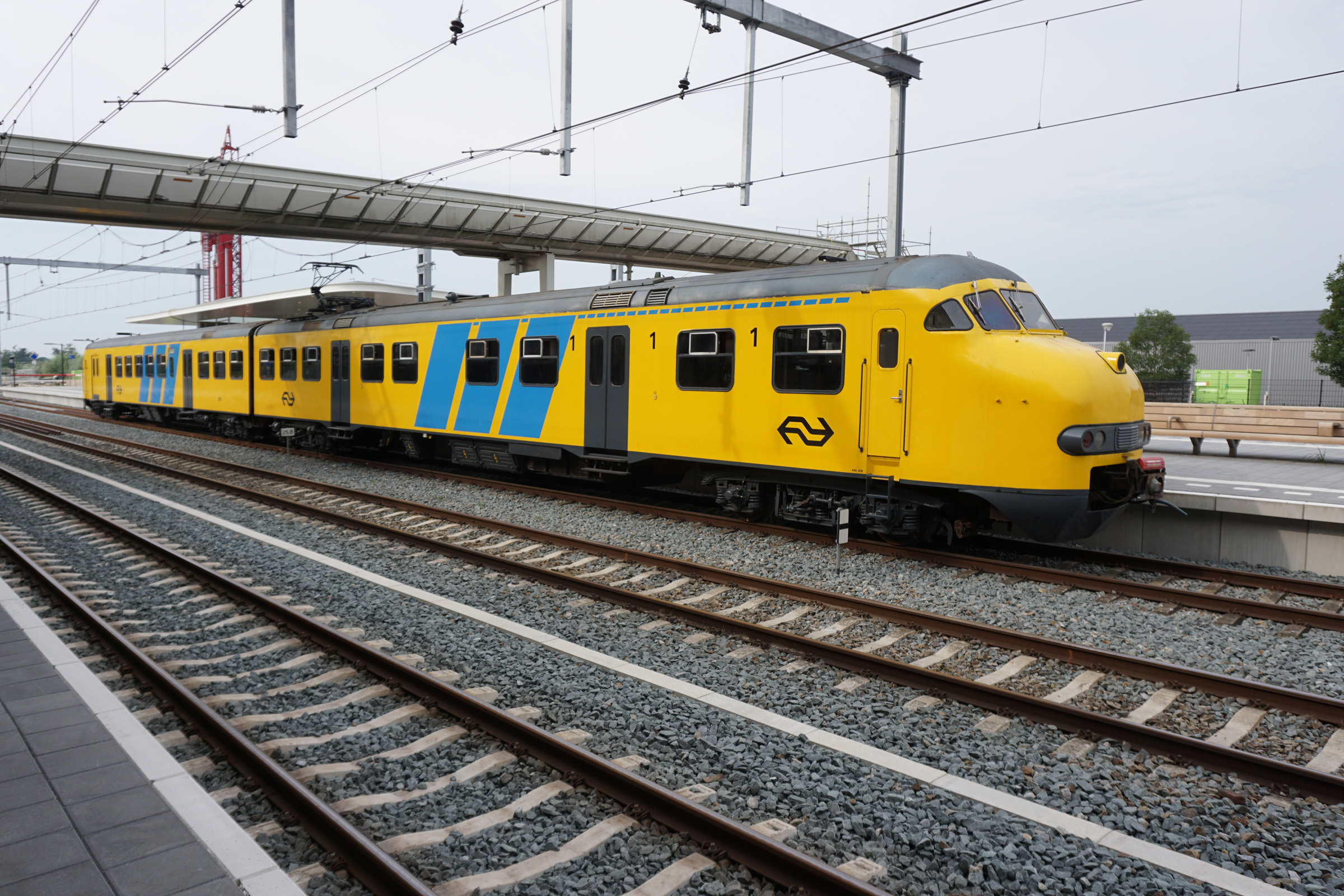 Geldermalsen, 24 juli 2021. Treinstel 876 van het Spoorwegmuseum tijdens een conditierit. Het treinstel is getooid in de gele huisstijl die vanaf 1968 bij NS werd ingevoerd. Foto: Nico Spilt.