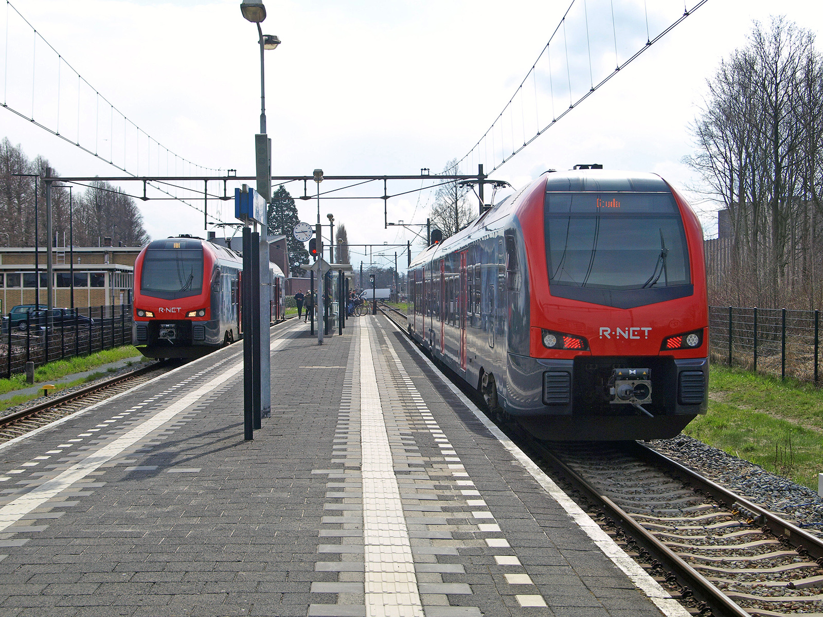 Voor de treindienst van Gouda naar Alphen aan de Rijn zijn de tweedelige Flirt-treinstellen in de uitmonstering van R-Net aangebracht. Op 4 april 2018 kruisen de 2011 en 2013 in Boskoop. Foto: Gerrit Nieuwenhuis.