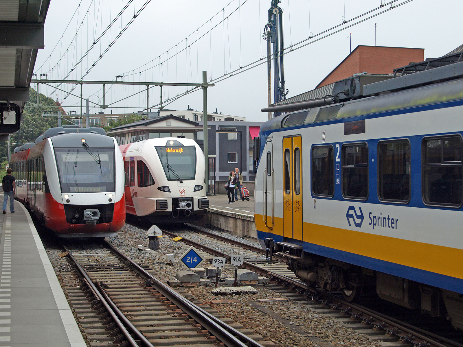 De regionalisering van het spoorvervoer is in Zutphen te zien met van links naar rechts een LINT van Syntus, een SPURT van Arriva en een Sprinter van NS op 15 juli 2014. Foto: Gerrit Nieuwenhuis.