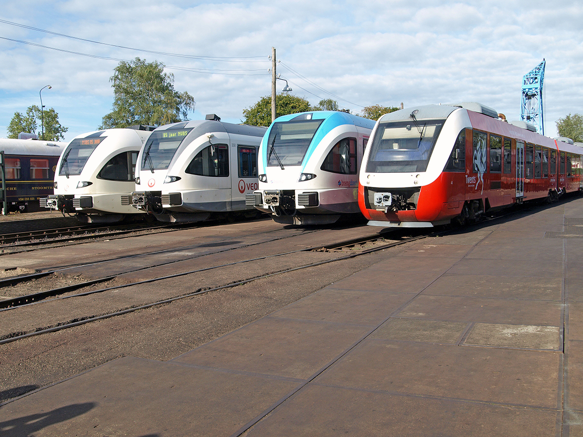 Op 8 oktober 2016 vierde de NVBS het 85-jarig bestaan met een line-up van verschillende dieseltreinstellen in Beekbergen. Van links naar rechts Arriva, Veolia, Breng en Syntus. Foto: Gerrit Nieuwenhuis.
