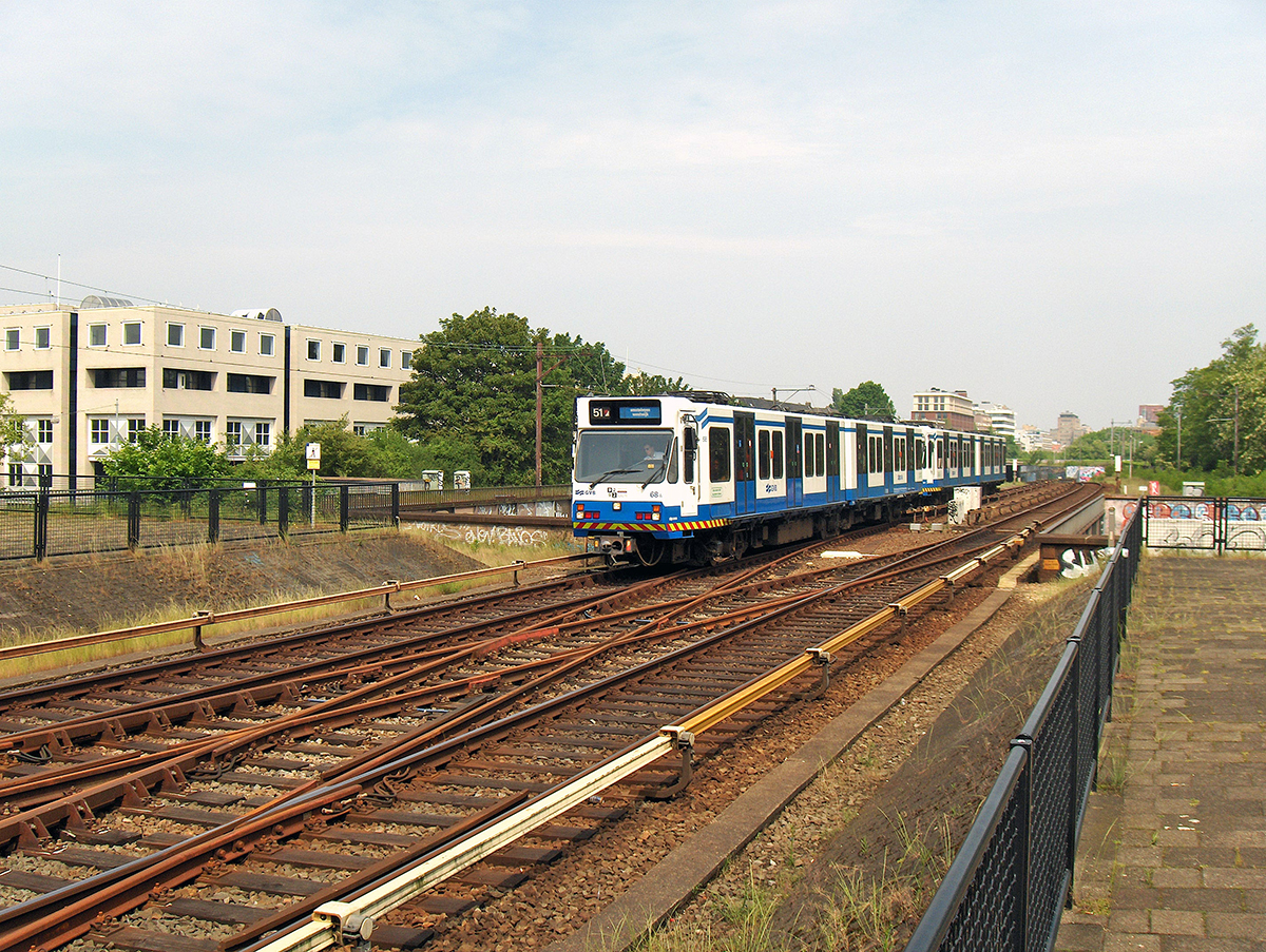Lijn 51 naar Amstelveen was deels als metro en deels als sneltram ingericht. Bij het Amstelstation komen twee stellen type S2 op 27 mei 2016 het station binnen. Foto: Gerrit Nieuwenhuis.