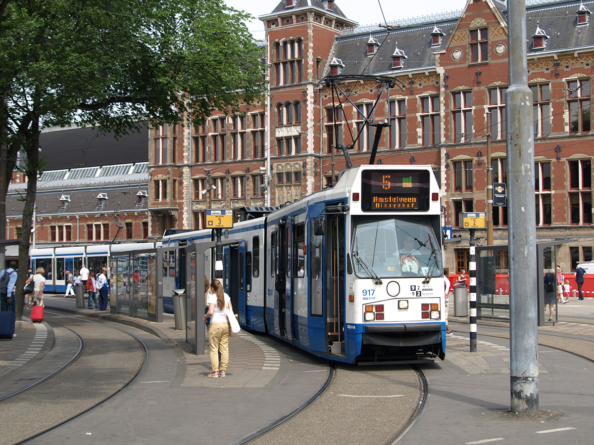 Op lijn 5 rijden de tweerichtingtrams, zoals de 917. Centraal Station, 16 juli 2013. Foto: Gerrit Nieuwenhuis.