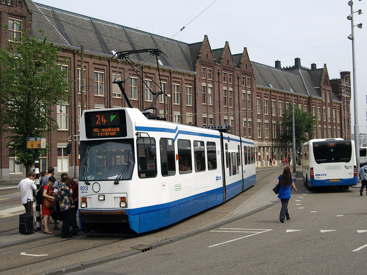 Een eenrichtingtram van BN, nummer 823, op lijn 24 voor het Centraal Station op 16 juli 2013. Foto: Gerrit Nieuwenhuis.