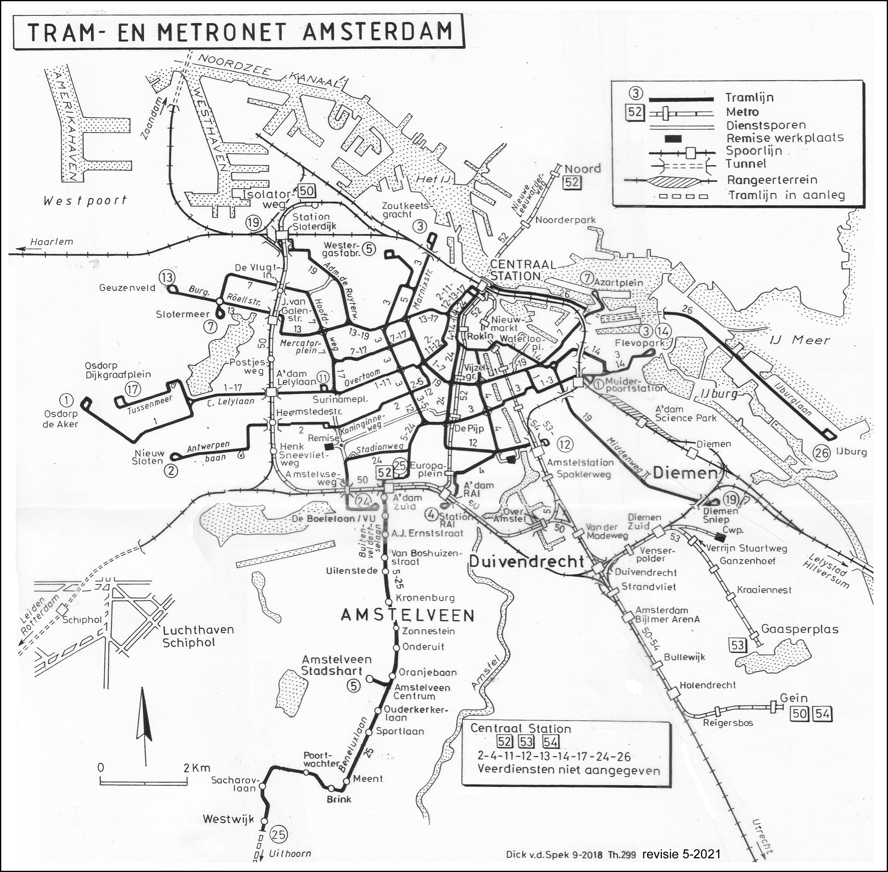 Het tram- en metronet van Amsterdam anno 2021. Tekening: Dick van der Spek.