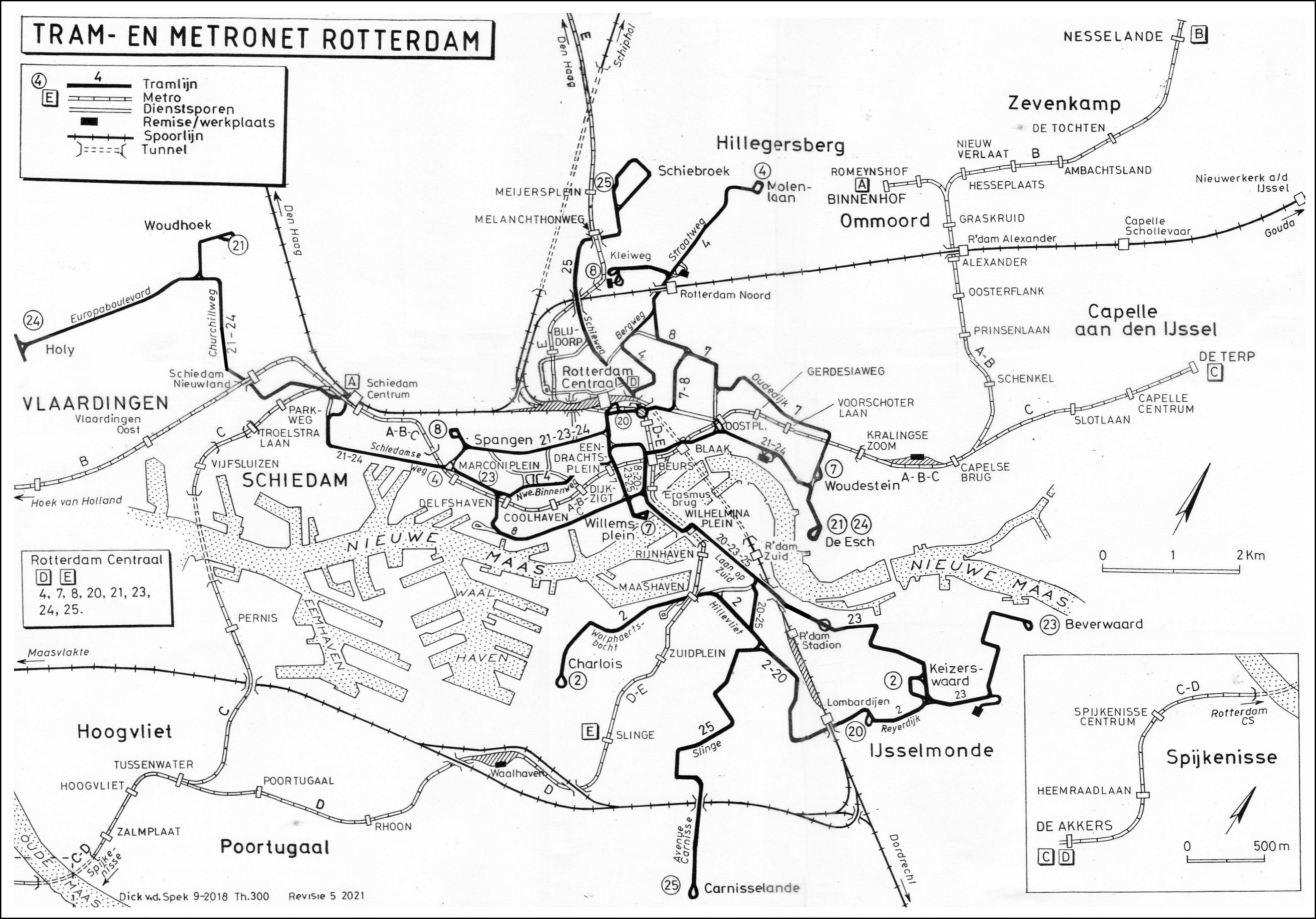 Het tram- en metronet van Rotterdam anno 2021. Tekening: Dick van der Spek.
