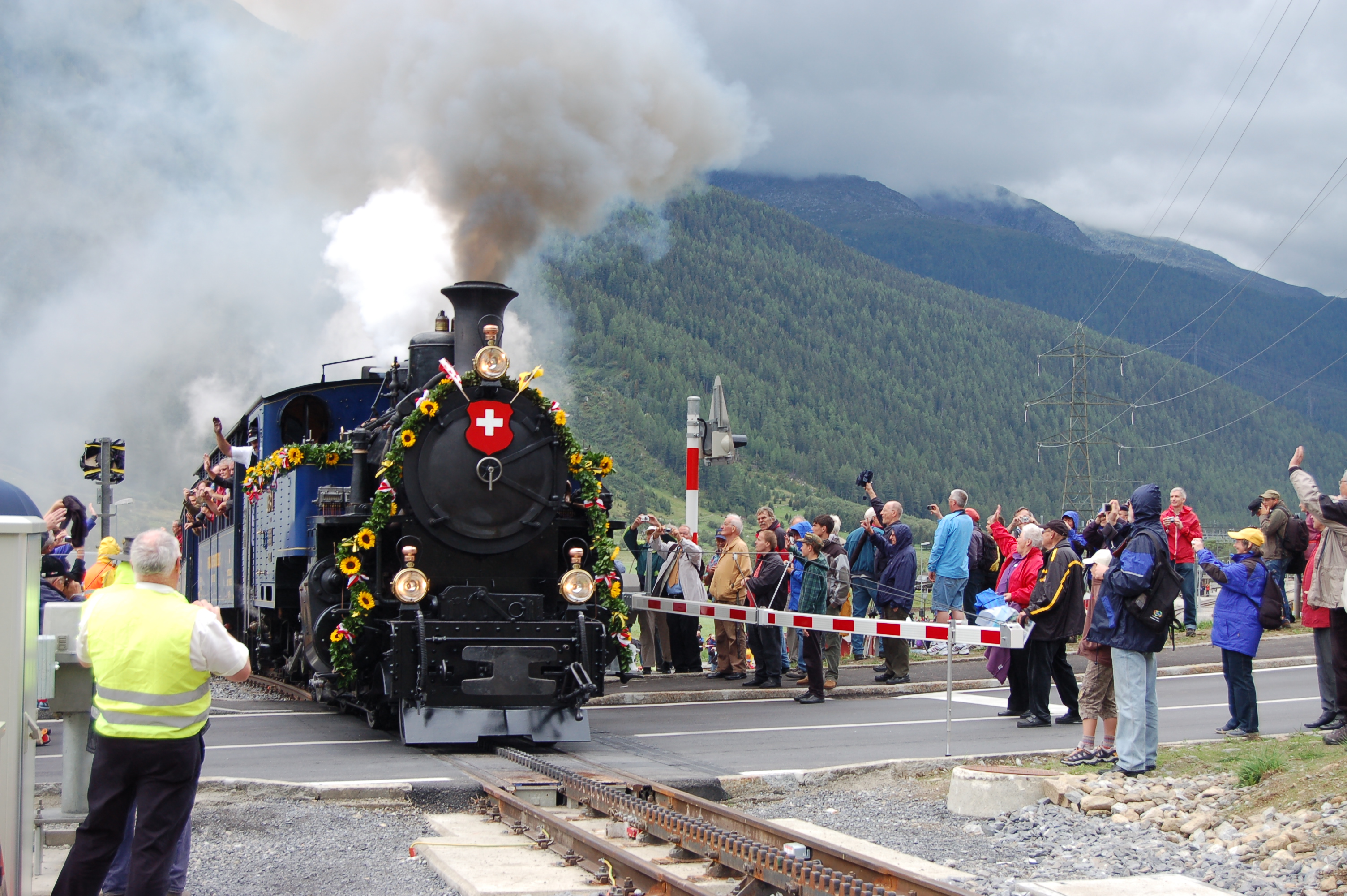 Oberwald, opening Gletsch — Oberwald, 12 augustus 2010, foto Hans Croes. Uiteindelijk wordt in 2010 Oberwald bereikt en is het hele traject te berijden. De openingstrein is versierd met, traditiegetrouw, zonnebloemen.