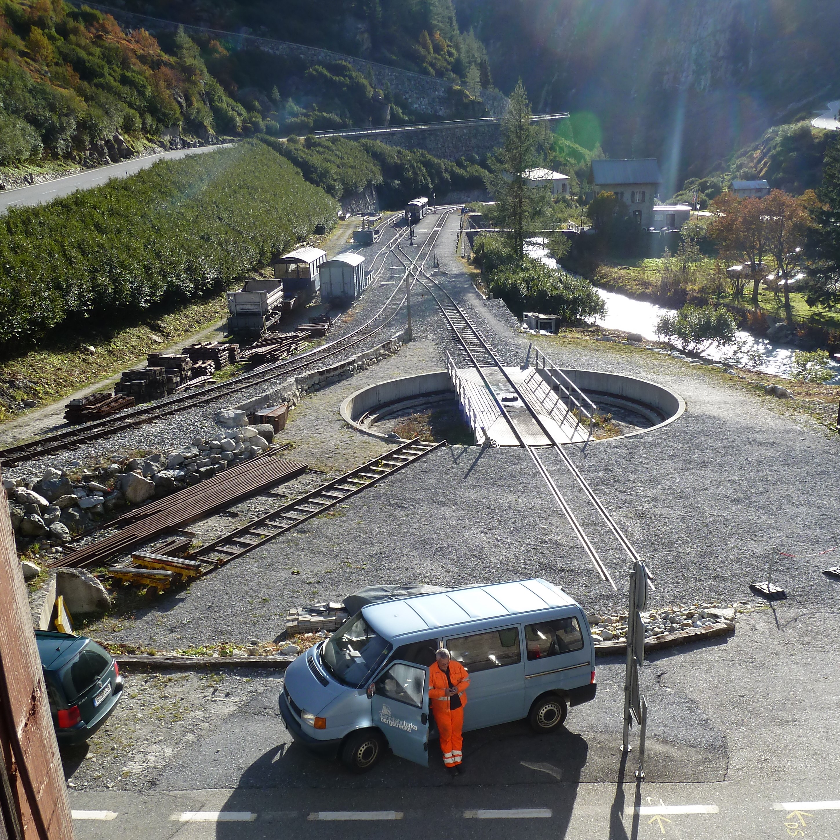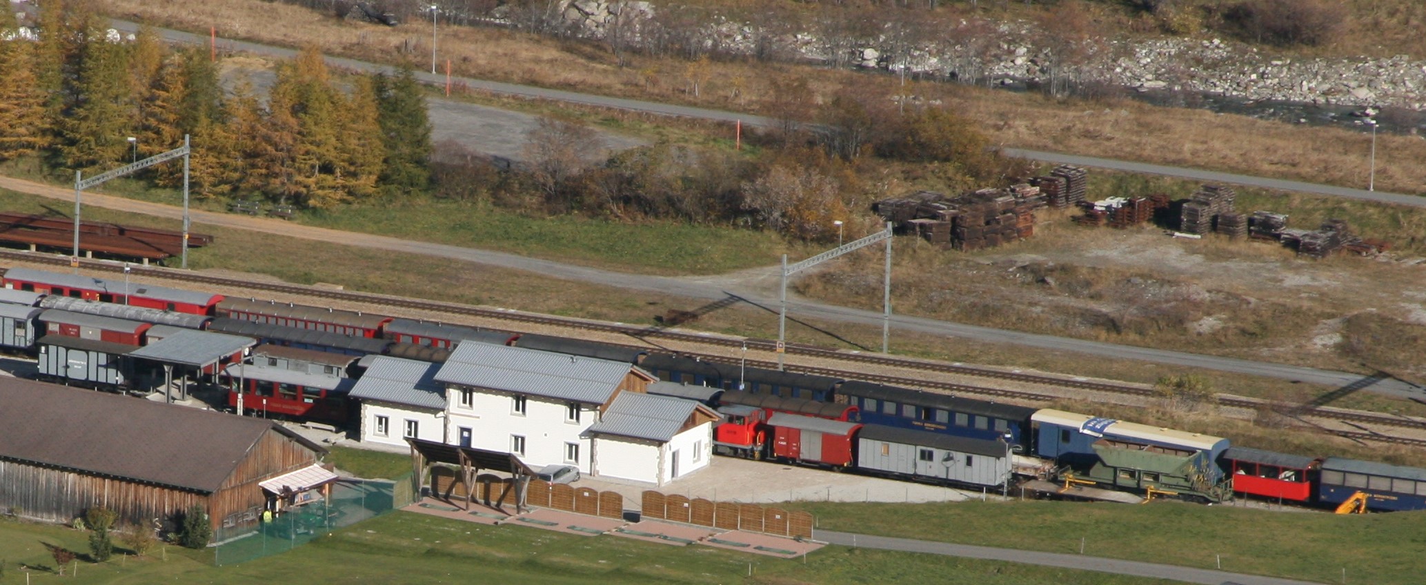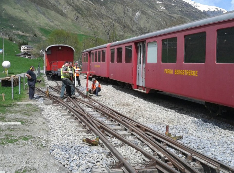 Realp, Engels wissel naar de Wagenremise, 2015, Foto Diederik van Nimwegen. Tot een jaar geleden stonden de rijtuigen in de winter in 2 tot 4 meter sneeuw. Omdat de ruituigbakken grotendeels uit hout bestaan, zorgt de sneeuw voor rot van het hout, waardoor de levensduur van rijtuigen geen 30 maar slechts 10 jaar is.