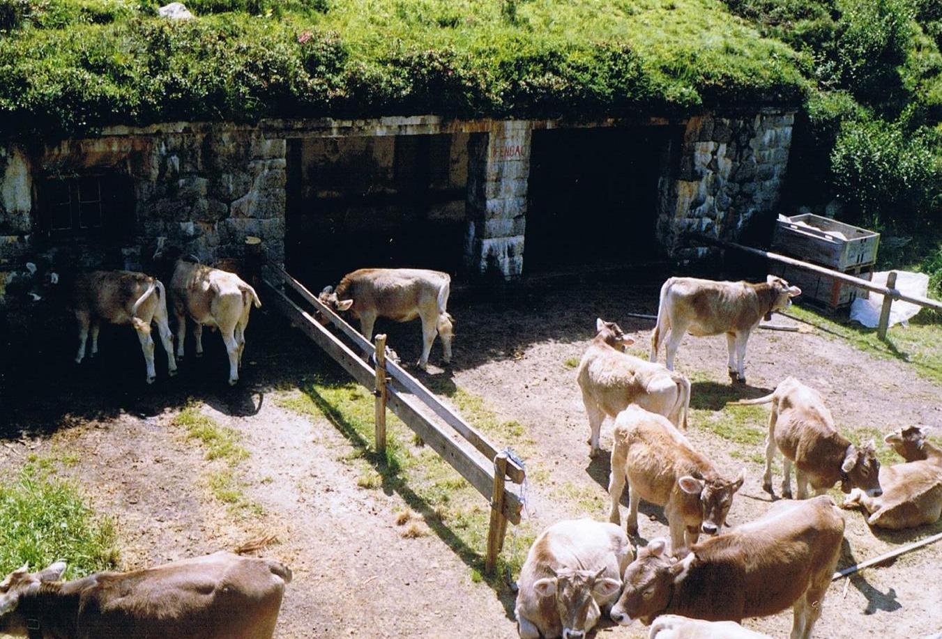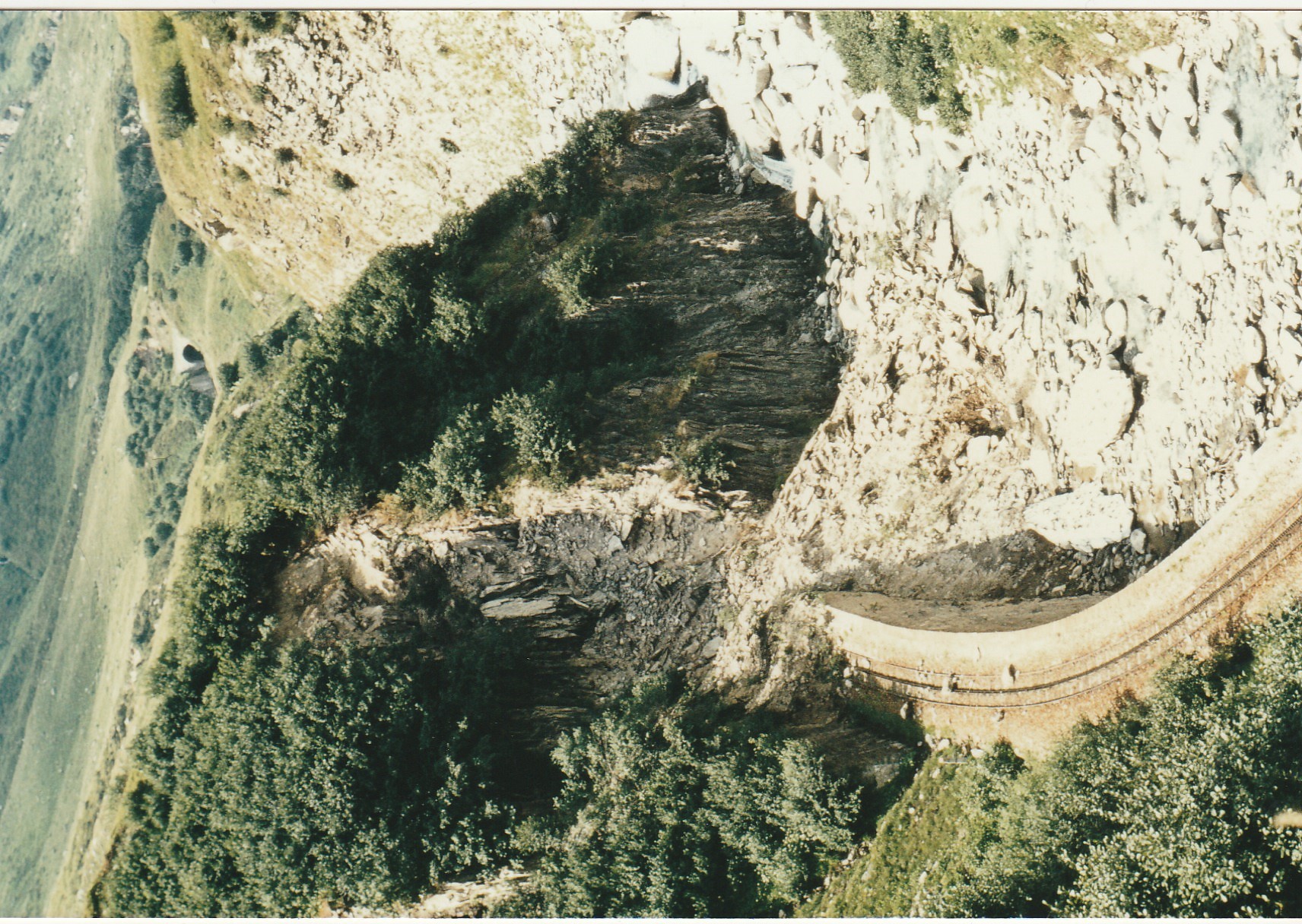 Instorting bij Alt-Senntumstafel-Tunnel III, opname van voor 1986, foto collectie Frans de Jong. De spoorlijn ligt ‘hoog’. De sterke weersinvloeden (sneeuw, ijs en lawine) samen met het wegvallen van inspecties en onderhoud, zorgden ervoor dat deze tunnelingang was ingestort.