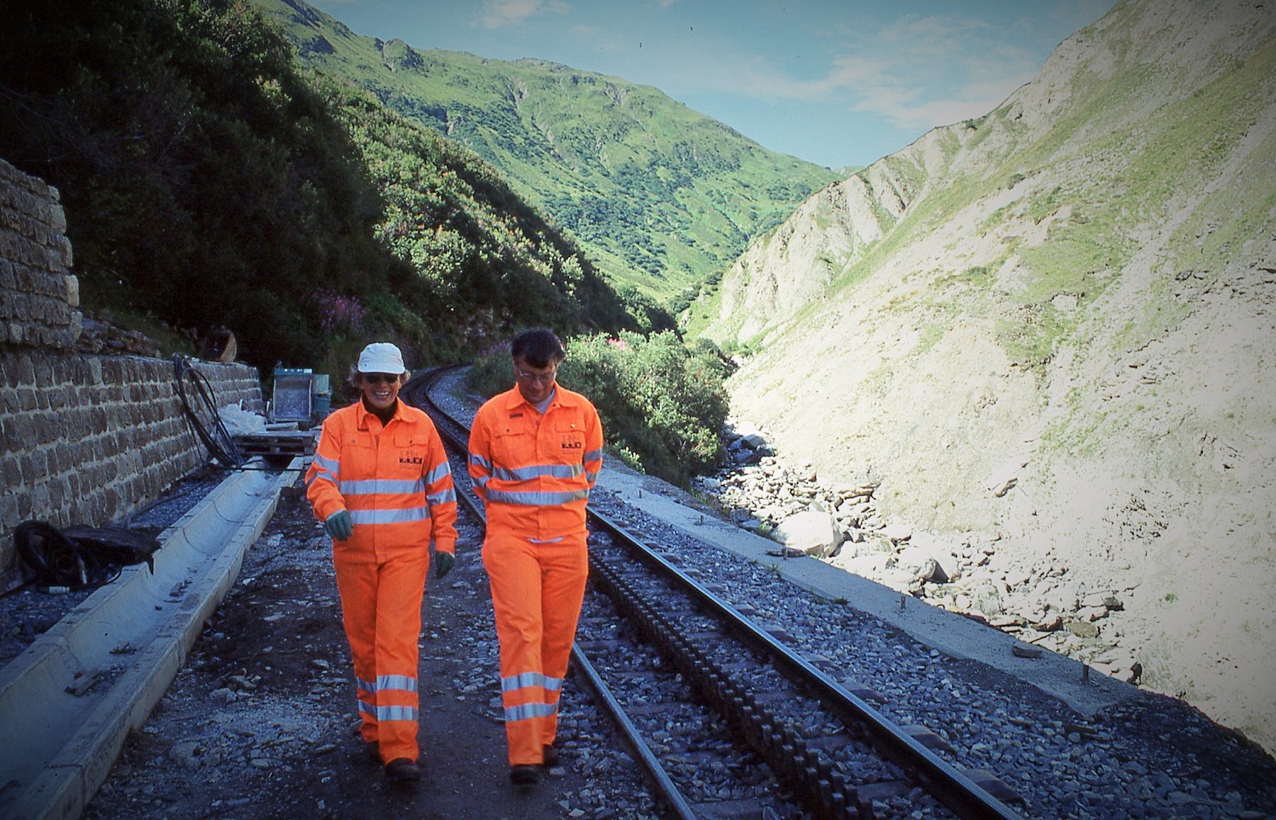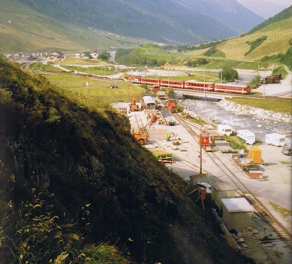 Realp, 1989, foto Ruerd Halbertsma. In de begintijd was er ‘niets’; een spoor met een tweedehands draaischijf en een aantal caravans. Het spoor van de Furka-Oberalp-Bahn is duidelijk te zien. Een aansluiting is er niet want de FO was toen niet zo blij met het initiatief van de ‘amateurs’. Later is dat goed gekomen. Op de achtergrond is het dorp Realp te zien.
