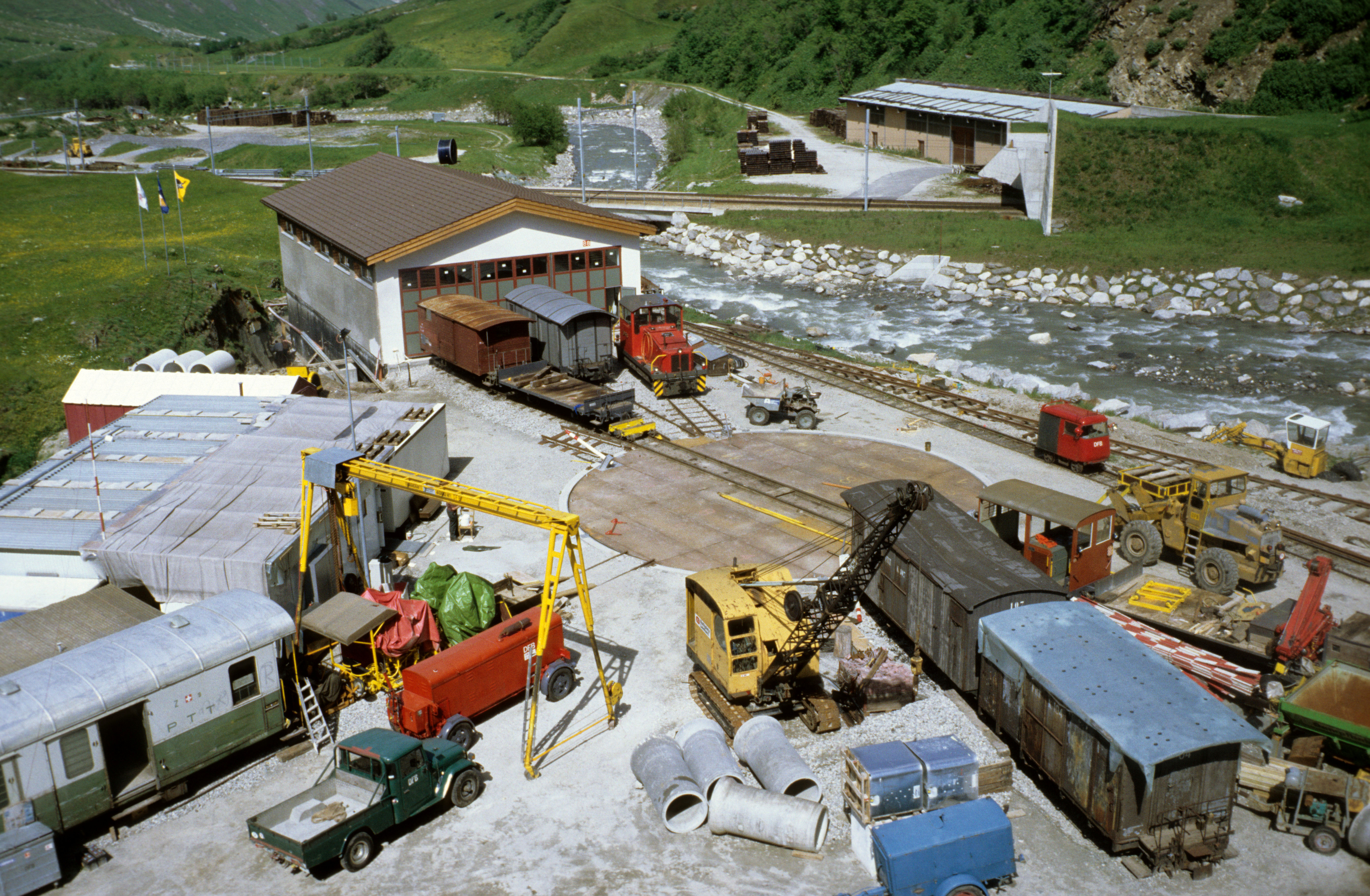 Realp, 1991, foto Jan Rümke. In vergelijking met de derde foto, zijn de voorzieningen in Realp uitgebreid. De locloods annex werkplaats is gebouwd en er staan containers voor gereedschap, etc.
