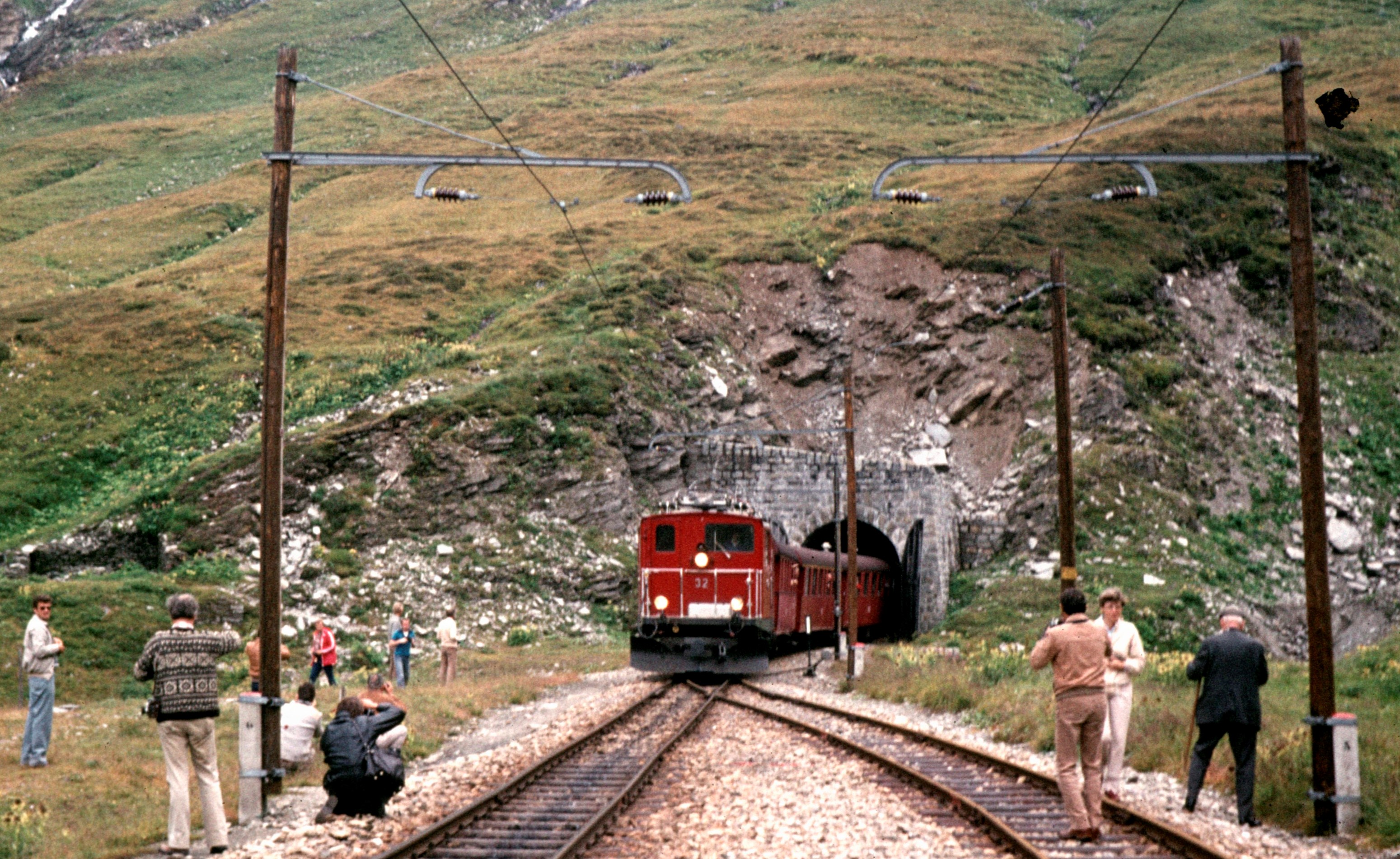 Station Furka in de ‘FO-tijd’, omstreeks 1981, foto Marcel Schuring. De bovenleiding is van hout. Voor de winter wordt deze gedemonteerd en daarna weer opgebouwd. Vanwege het naderende einde van het gebruik door de FO is het druk met fotografen en worden ook extra treinen ingelegd.