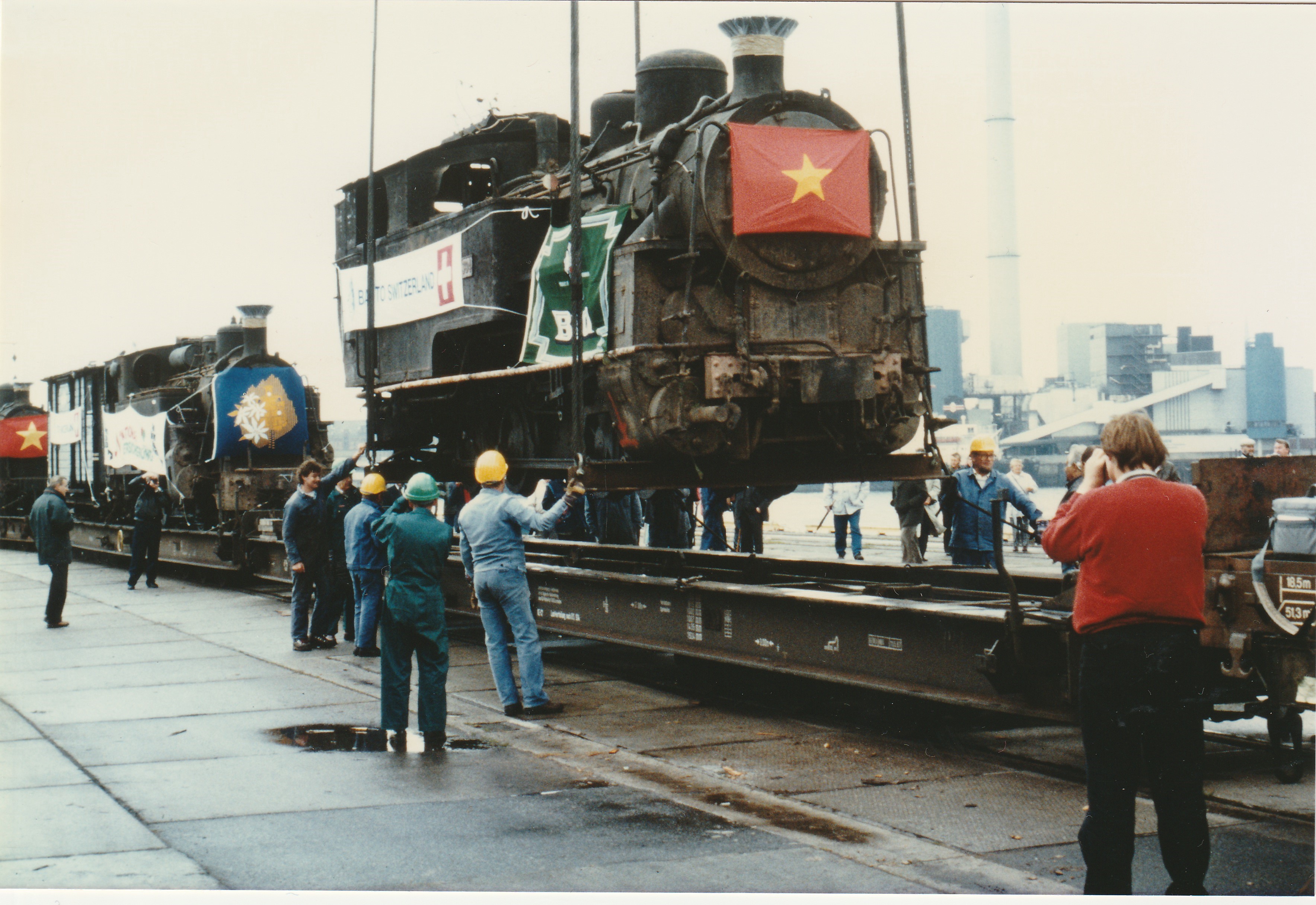 Hamburg, 1990, collectie Frans de Jong. Enkele originele stoomlocomotieven zijn met een spectaculaire actie teruggehaald uit de rimboe in het binnenland van Vietnam. Deze foto is gemaakt in de haven van Hamburg, waar de locs van het zeeschip worden overgeladen op een goederenwagen.
