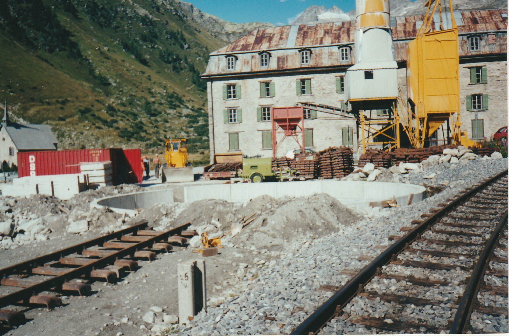 Gletsch, 2000 week 35, foto Arnold Koestal. Intussen is het traject waarover kan worden gereden steeds langer geworden. Realp was het startpunt. Vanaf daar werd eerst Tiefenbach bereikt; de koeienstal werd halte. Daarna was station Furka aan de beurt, gevolgd door de Furka Scheiteltunnel en de halte Muttbach- Belvedère. Op deze foto zien we ‘bouwplaats’ Gletsch.