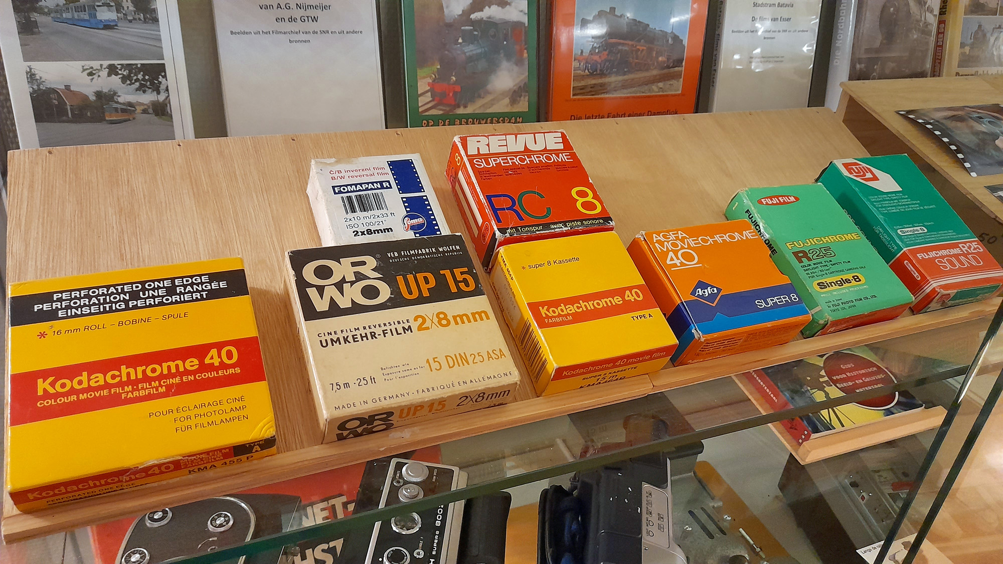 Van Onno Petersen kregen we ook materialen in bruikleen voor deze vitrine. De filmverpakkingen die je ziet komen uit zijn collectie. In de meeste daarvan zitten nog ongebruikte films. In het linkerdoosje zit een film van 16 millimeter. Dat was heel lang het gangbare formaat voor het maken van filmreportages. Ook welgestelde amateurs gebruikten dit formaat. Bredere formaten, voor gebruik in bioscopen, bestonden ook. Bijvoorbeeld 35 mm, hetzelfde formaat dat vroeger vaak in fototoestellen (kleinbeeldcamera’s) werd gebruikt.