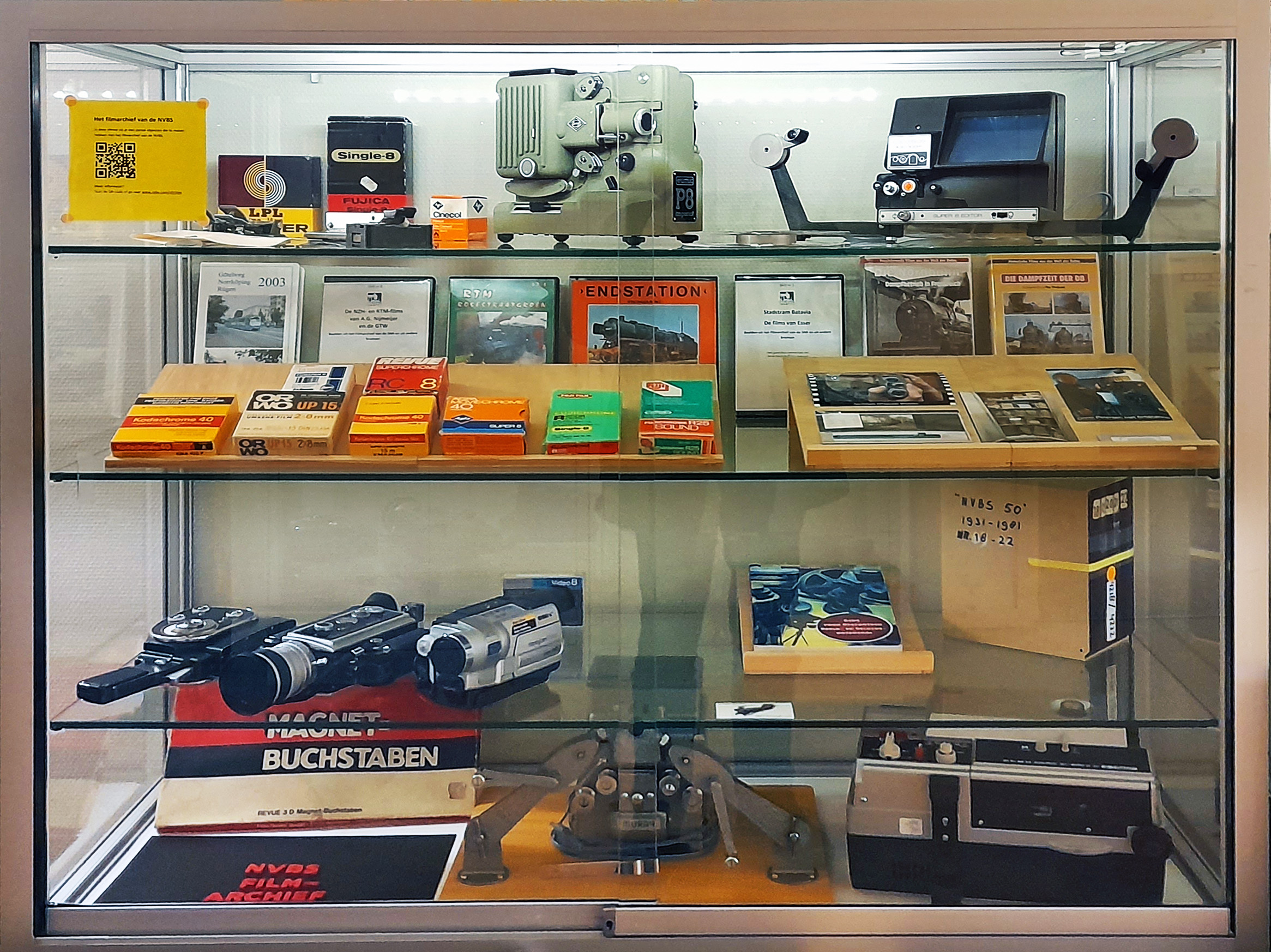 Het lastige van films is dat je ze niet snel even kunt bekijken. Je ziet pas wat er op staat als je ze projecteert. Dat kan met een projector en een scherm, maar sneller gaat het met een viewer. In de vitrine zie je een paar projectoren en viewers. Ook zie je materialen waarmee films konden worden gemonteerd. Dat ging letterlijk met knippen en plakken.