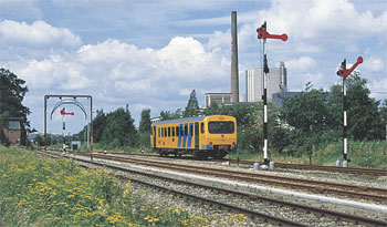 Jarenlang waren de Wadlopers een vertrouwde verschijning op de diesellijnen in Groningen en Friesland. Vooral in combinatie met armseinen straalden deze nog een echte lokaalspoorsfeer uit. Motorrijtuig 3119 vertrekt uit Winschoten op 30 juli 1988. Foto: Raymond Kiès.