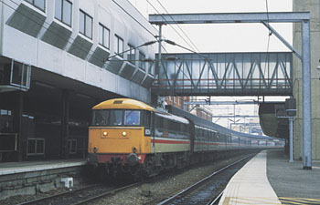 Eurocity Benjamin Britten met loc 86 254, van dezelfde class als die de verongelukte trein uit Londen trok. Harwich, 15 juli 1987.Foto: Harrie Peters.