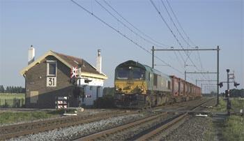 De locomotieven class 66 zijn nog steeds gezichtsbepalend bij een aantal vervoerders. De PB02 van Rail4Chem met de Diepholzshuttle bij Kerkdriel; 24 juli 2008. Foto: Ton Machielsen