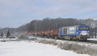 Rurtalbahn-loc V206 met een ketelwagen – trein uit Pernis bij Hüthum, ten westen van Emmerich; 30 januari 2010. Foto: Hugo van Vondelen.