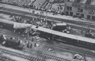 De bij de botsing in elkaar geschoven treinstellen 162 van trein 3212 en 276 van trein 516; Elst, 13 oktober 1954. Foto Spoorwegrecherche; archief Het Utrechts Archief.