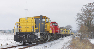 Op 13 februari 2010 voerde DB Schenker railstaven aan voor het Belgische gedeelte van Maastricht – Lanaken, de tot nu toe enige trein aan Belgische zijde in Lanaken. De trein met de locs 6509 en 6513 rijdt geduwd ter hoogte van de landsgrens. Foto: Laurent Joseph.