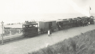 HSM-tram aan het eindpunt op de Katwijkse Boulevard, met onder meer loc 218 en twee ex-RSTM-rijtuigen; 1899. Links van de loc op het strand de bomschuit KW6. Foto: verzameling Historisch Genootschap De Blauwe Tram.