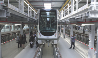 Verhoogd gelegen werksporen en loopbruggen om goed bij de apparatuur onder aan en boven op de Citadis-trams te kunnen komen; 15 augustus 2011. Foto: Maurits van den Toorn.