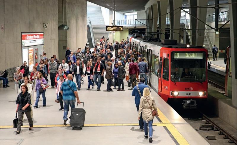 Stadtbahn zoals het is bedoeld: druk vervoer op een eigen, in dit geval ondergronds, tracé. Twee Stadtbahn B-stellen van de derde generatie in Keulen. Station Breslauer Platz/ Hauptbahnhof, 30 augustus 2014. Foto: Maurits van den Toorn.