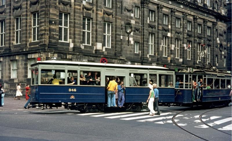 De in 1930 gebouwde Amsterdamse bijwagen 946 met middenbalkon met lage vloer achter het Paleis op de Dam; 21 juni 1975. Foto: Johan Blok.