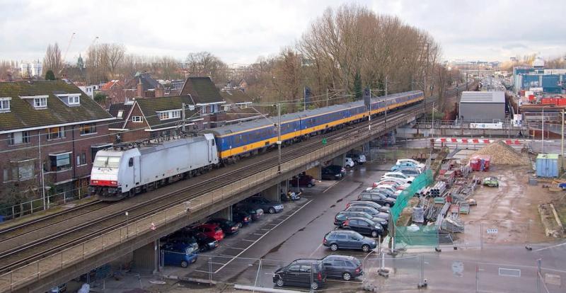 Locomotief E186 142 met Beneluxtrein 9248 (Amsterdam C – Brussel Z) op het spoorviaduct in Delft; 31 januari 2015. Foto: Chris Pescher.