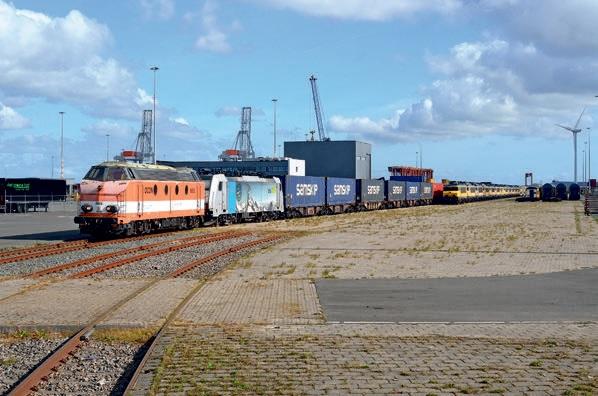 CapTrain begon in oktober regelmatig containervervoer naar de Amsterdamse Houtrakpolder, in aansluiting op een veerdienst van TMA naar het Verenigd Koninkrijk. Op 7 oktober 2018 staat locomotief 9802 van Rail Force One met de trein bij de containerterminal HTC. Traxx 186 104 van het Zwitserse BLS Cargo zal de trein vanaf het emplacement Aziëweg naar Italië brengen. Foto: Dennis Koster.